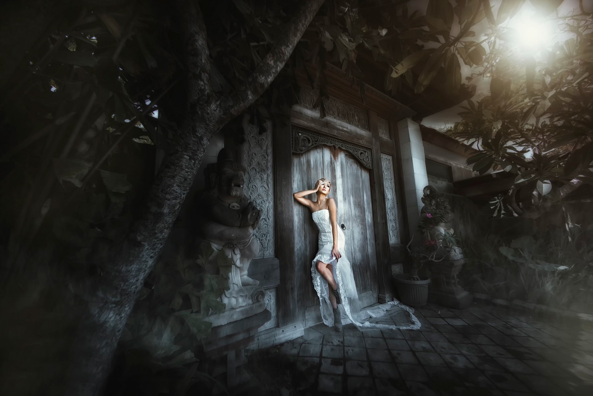 Dziewczyna w lekkiej białej sukni przy bramie