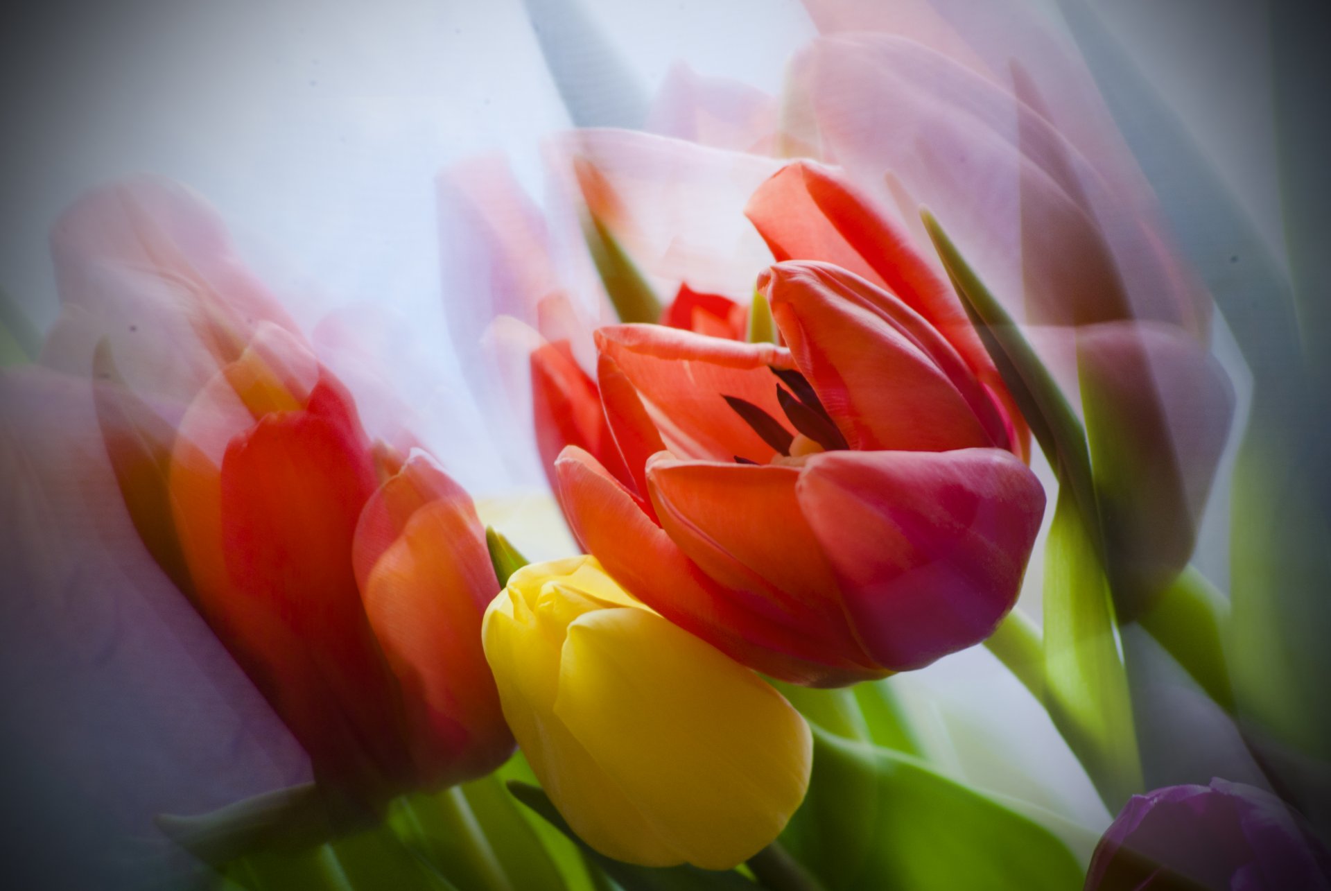 Bukiet tulipanów w wiadrze na stole z tulipanami i latającymi motylami