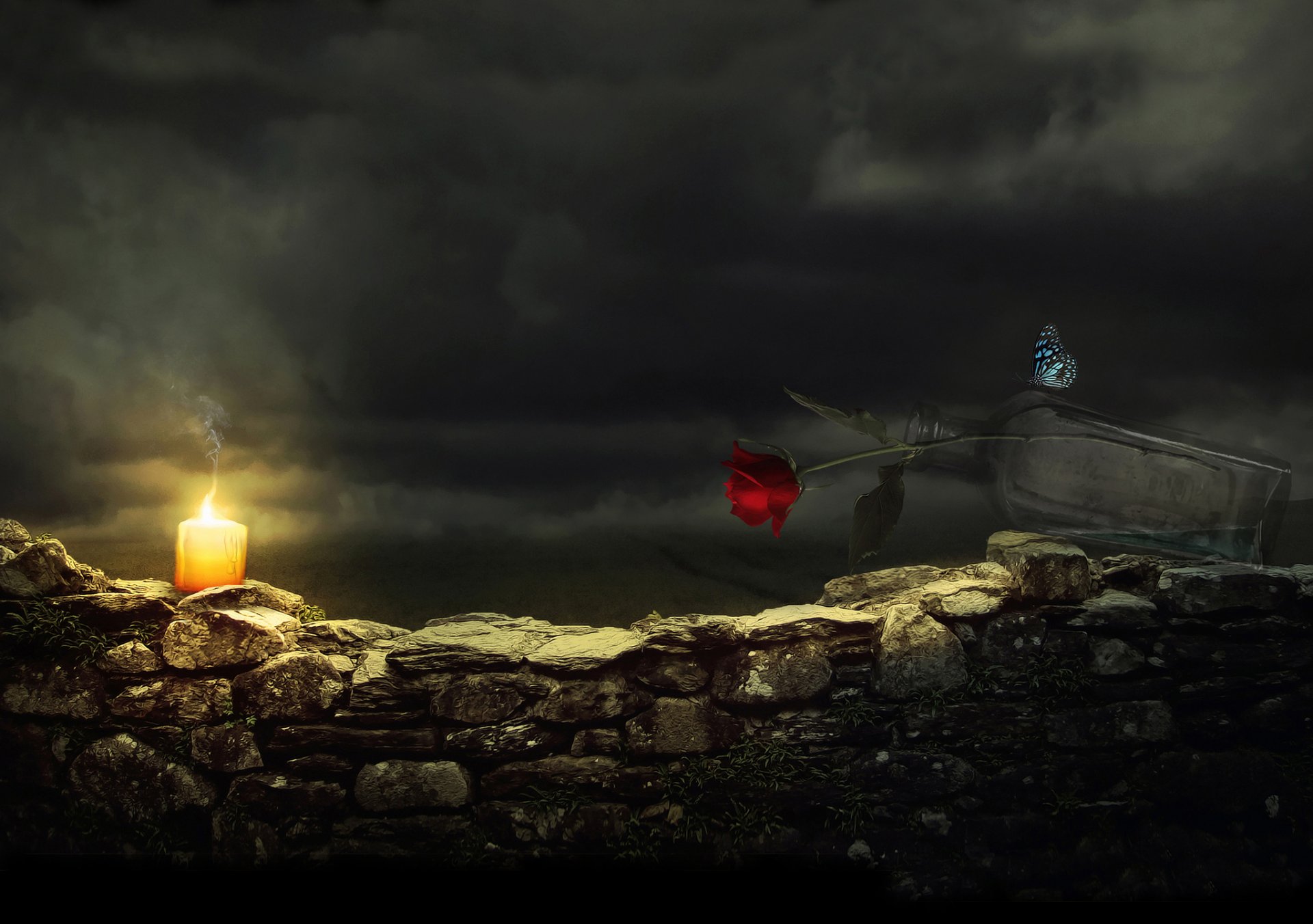 Świeca, motyl i czerwona róża w butelce na kamiennym żywopłocie w nocy