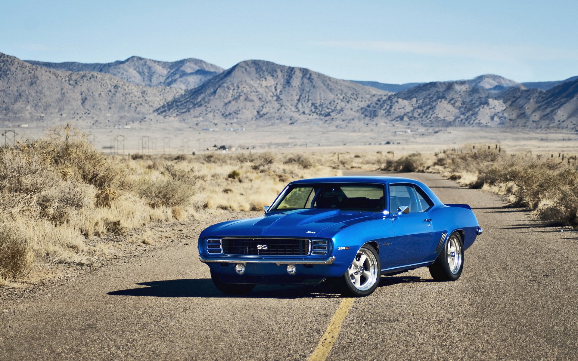 Niebieski chevrolet na drodze na tle gór