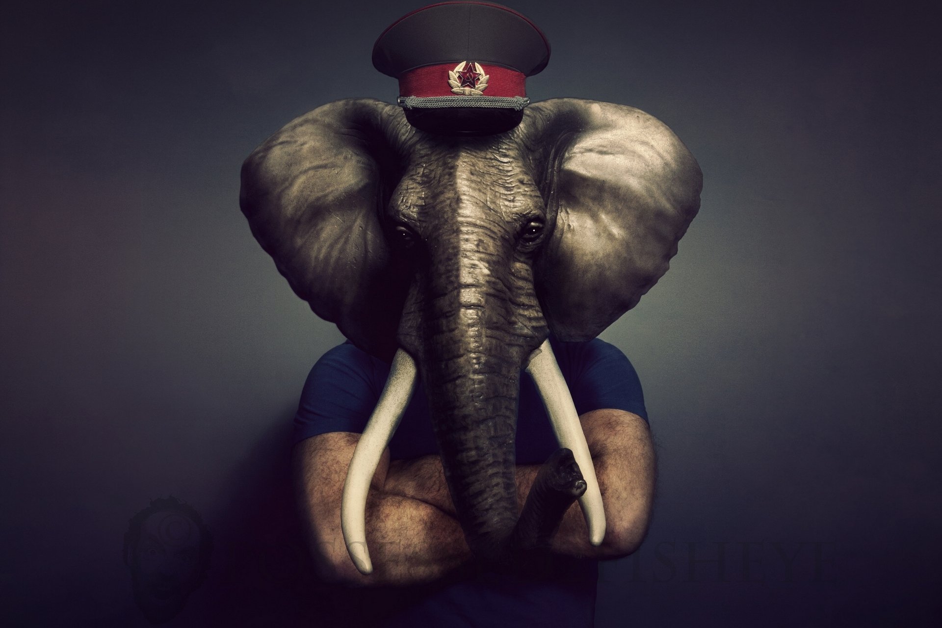 Słoń w czapce z pniem i kłami