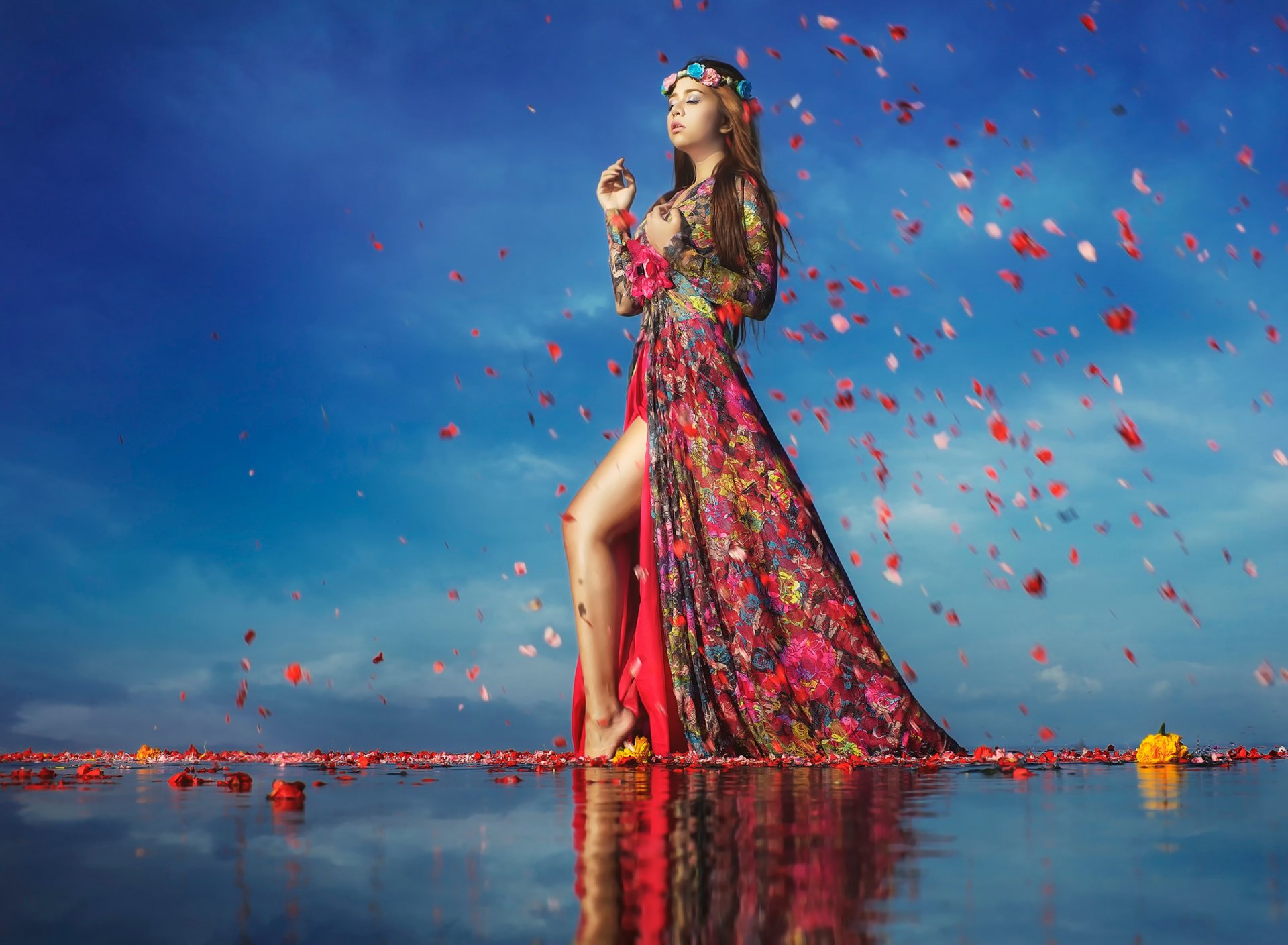 Dziewczyna z płatkami kwiatów w czerwieni na wodzieDziewczyna z płatkami kwiatów w Czerwieni na wodzie