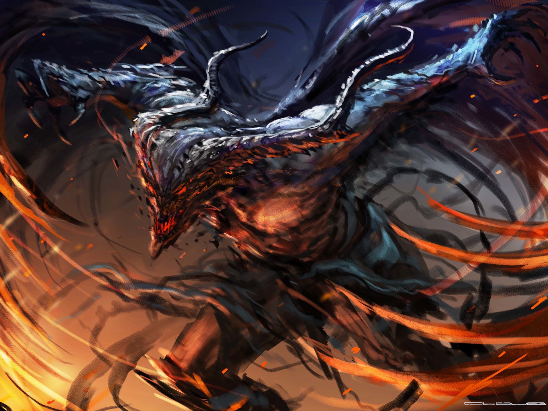 Rogaty Demon z mieczem i ludzkimi czaszkami