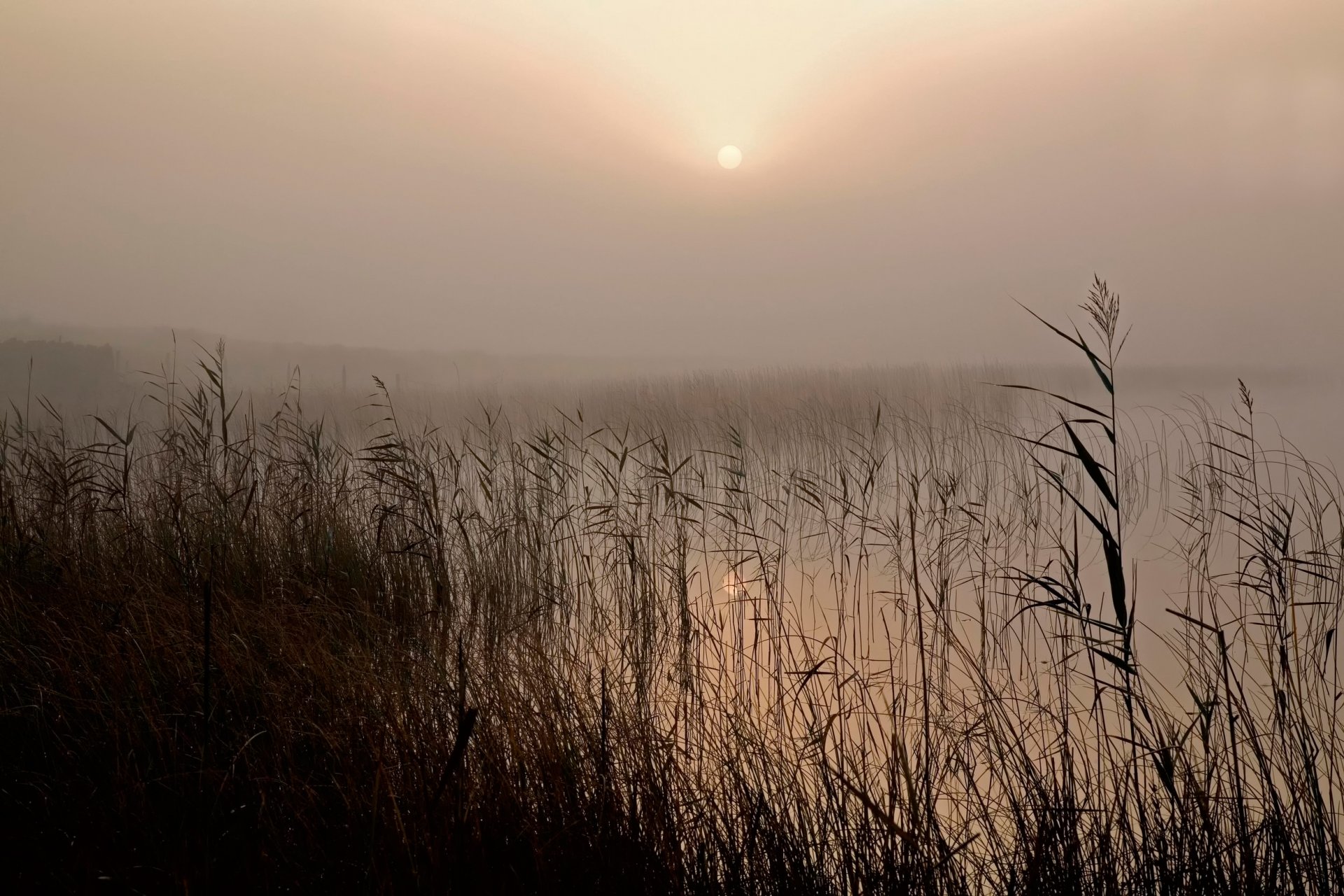Most w jesiennym lesie nad jeziorem we mgle w promieniach słońca