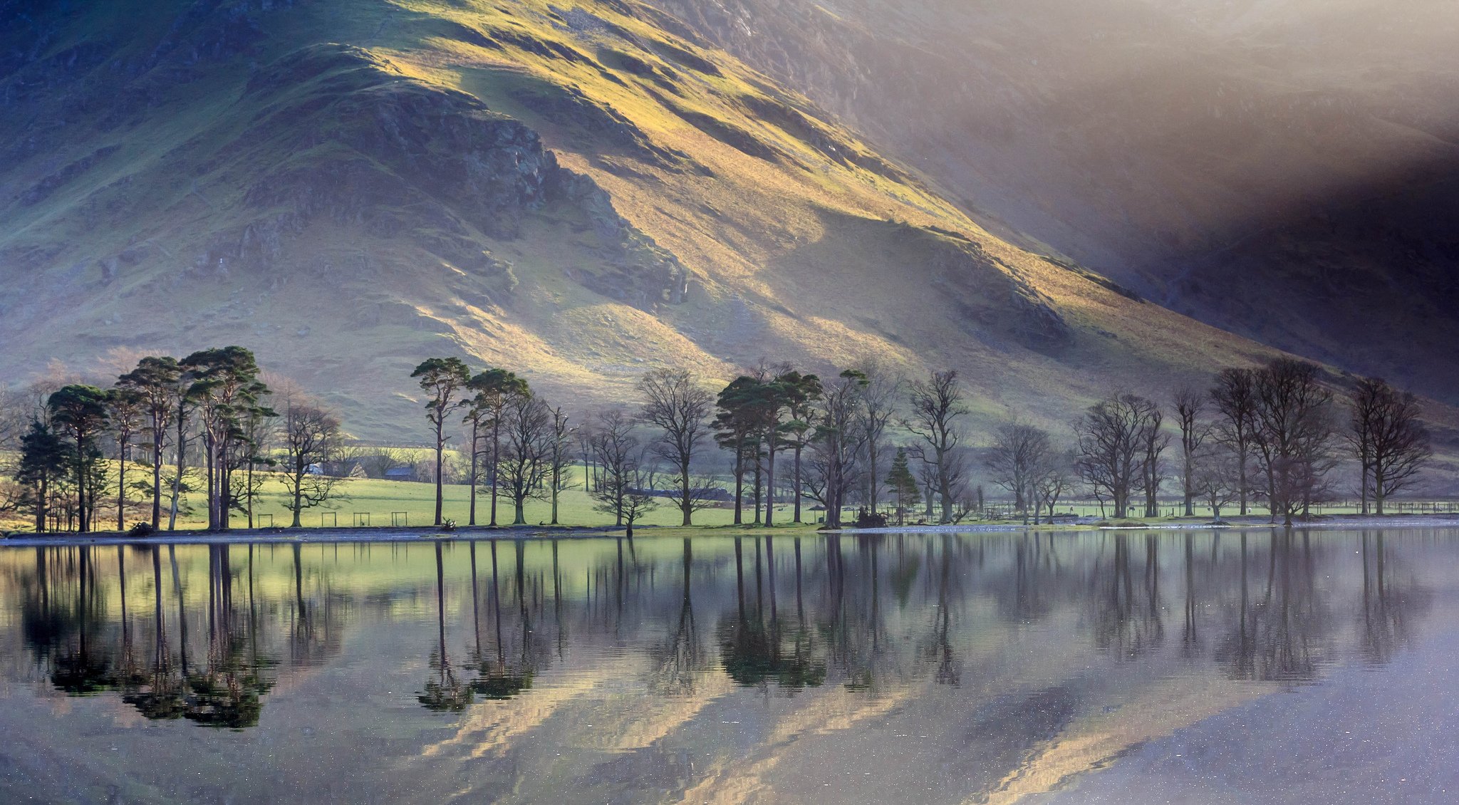 Samotne drzewa nad jeziorem w górach