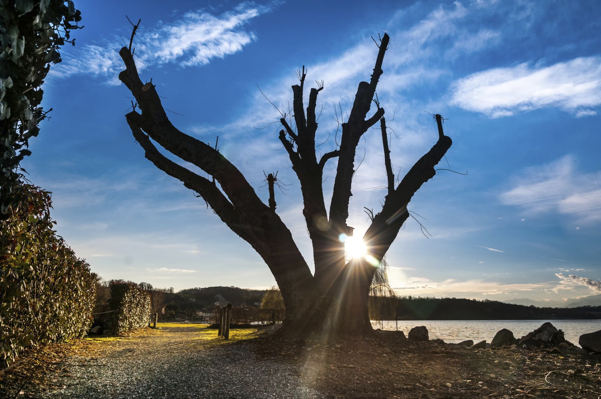 Piękne ujęcie. Samotne drzewo na brzegu. Cumulus na niebie