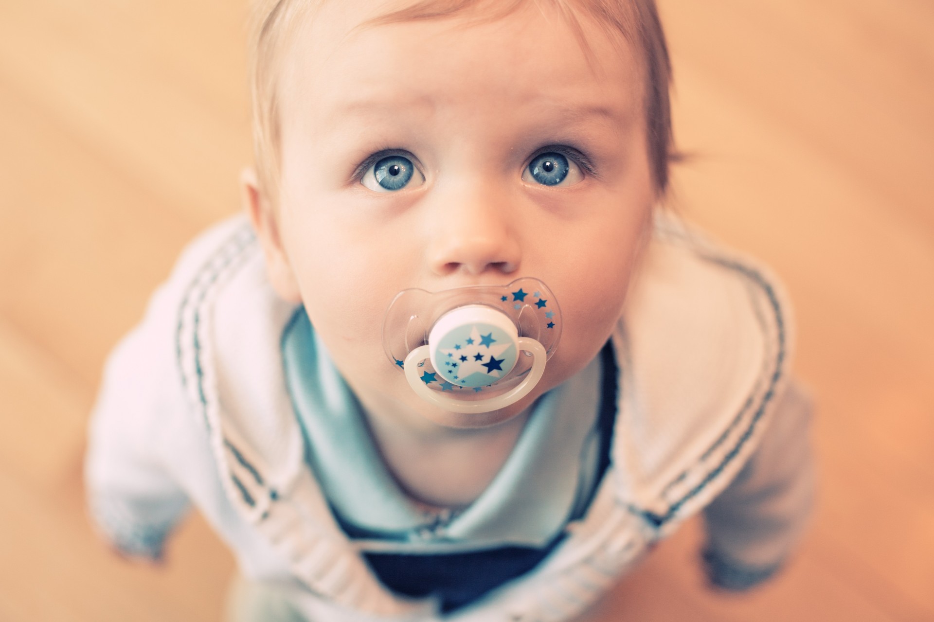Dziecko o niebieskich, pięknych oczach ssie smoczek