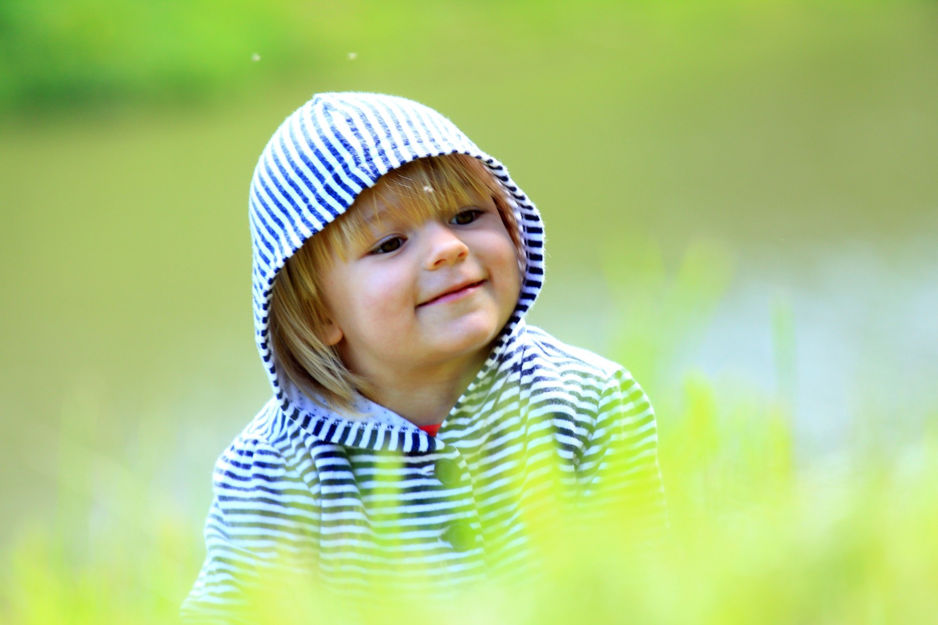 Dziecko w pasiastym kapturze na zielonym tle