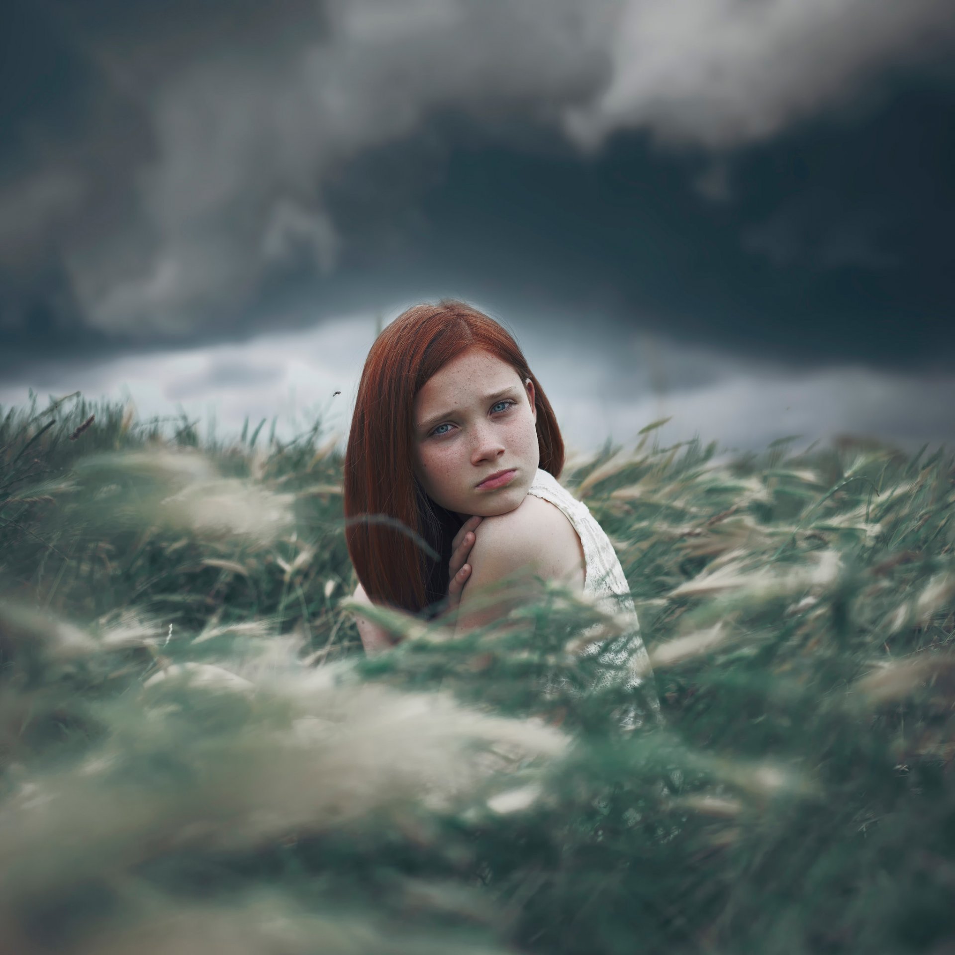 Rudowłosa piegowata dziewczyna na tle natury