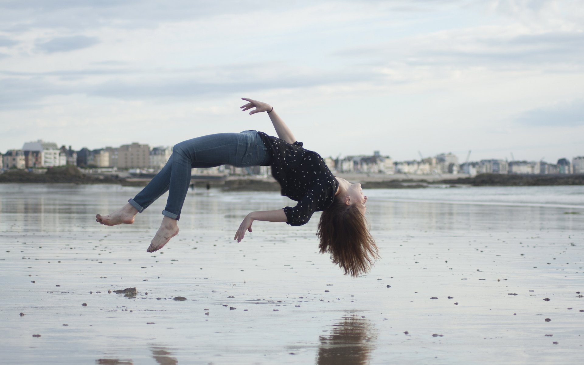 Dziewczyna na plaży w mieście, lewitacja