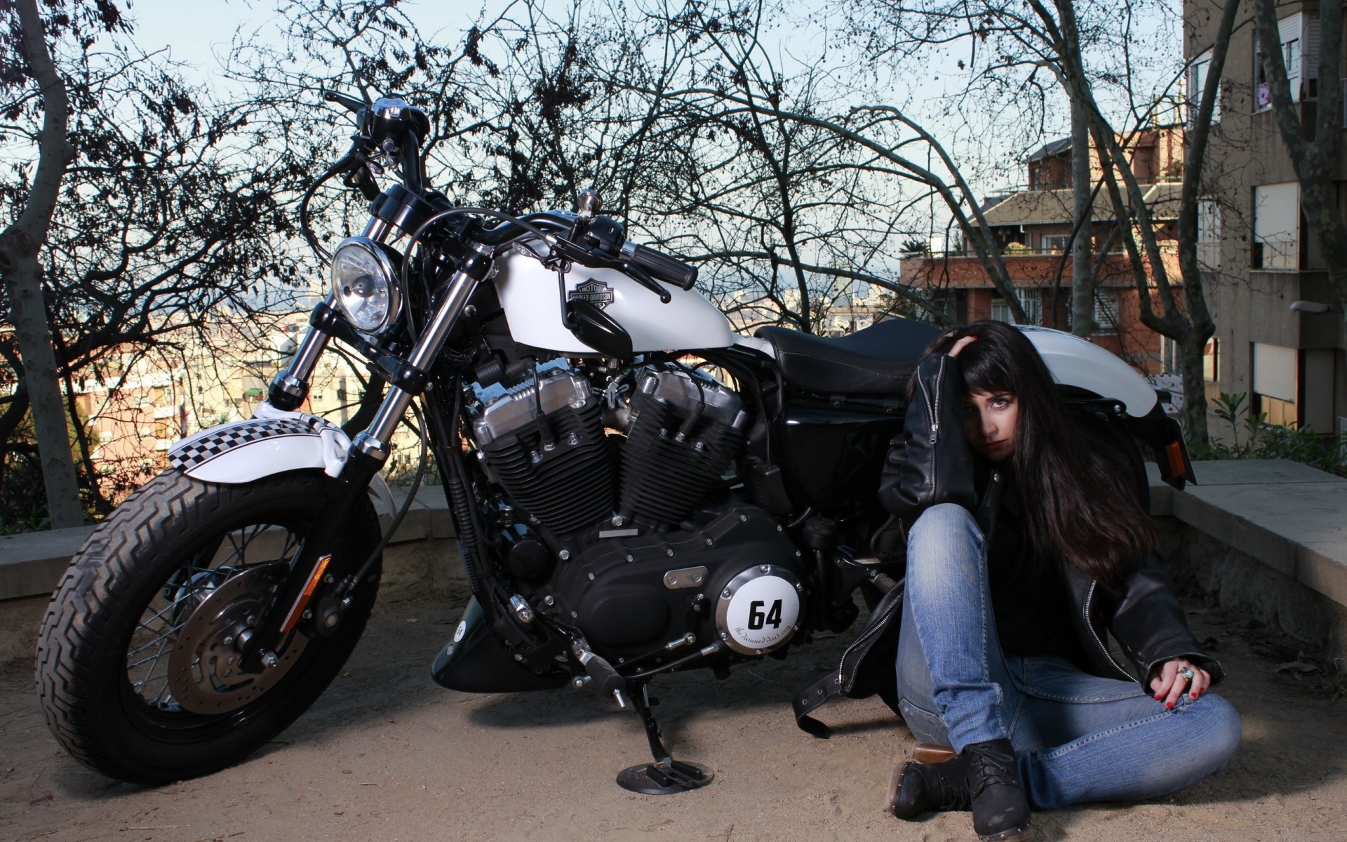 Piękna dziewczyna w czerwonym kostiumie kąpielowym na motocyklu