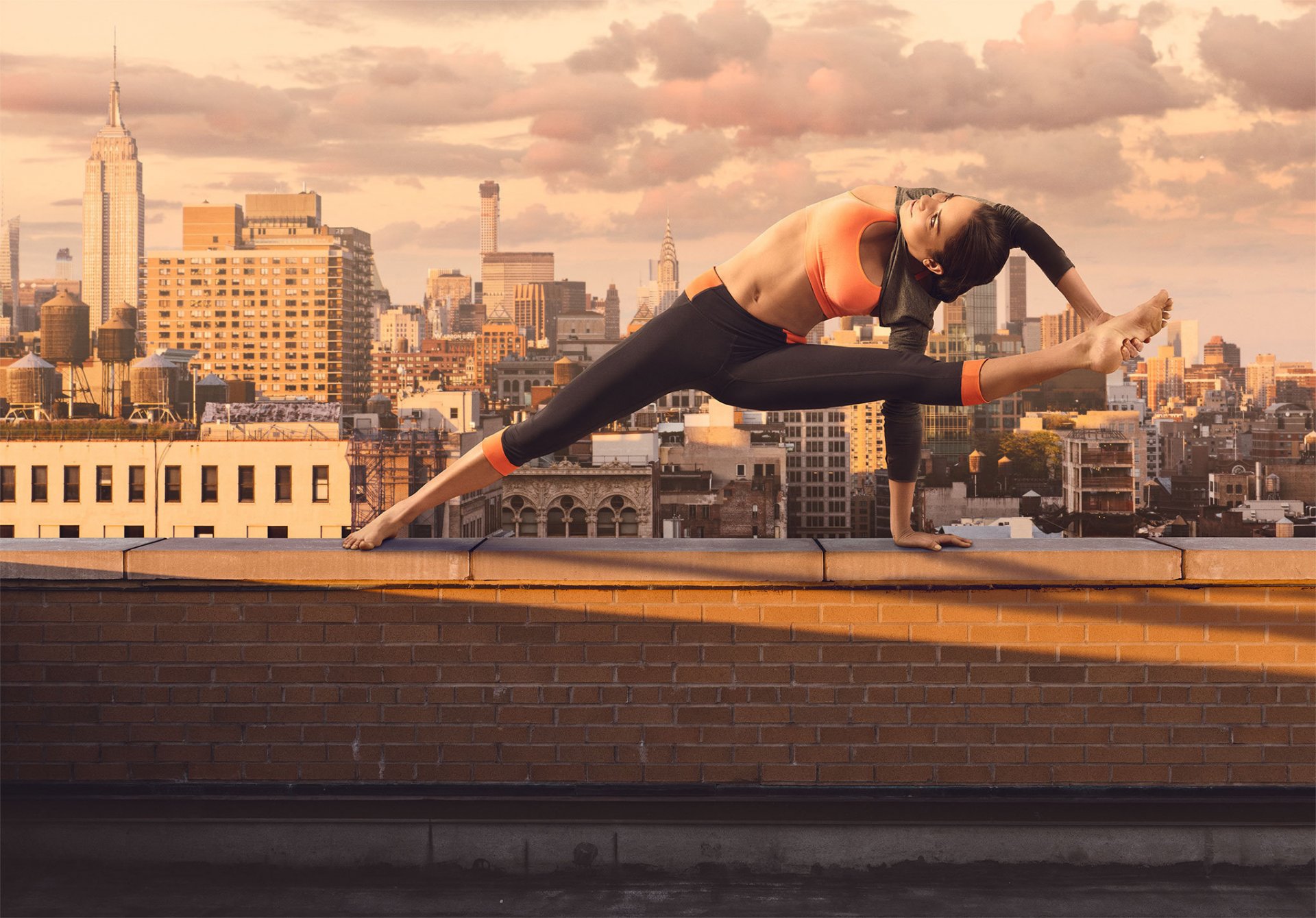 Dziewczyna zajmuje się rozciąganiem na dachu
