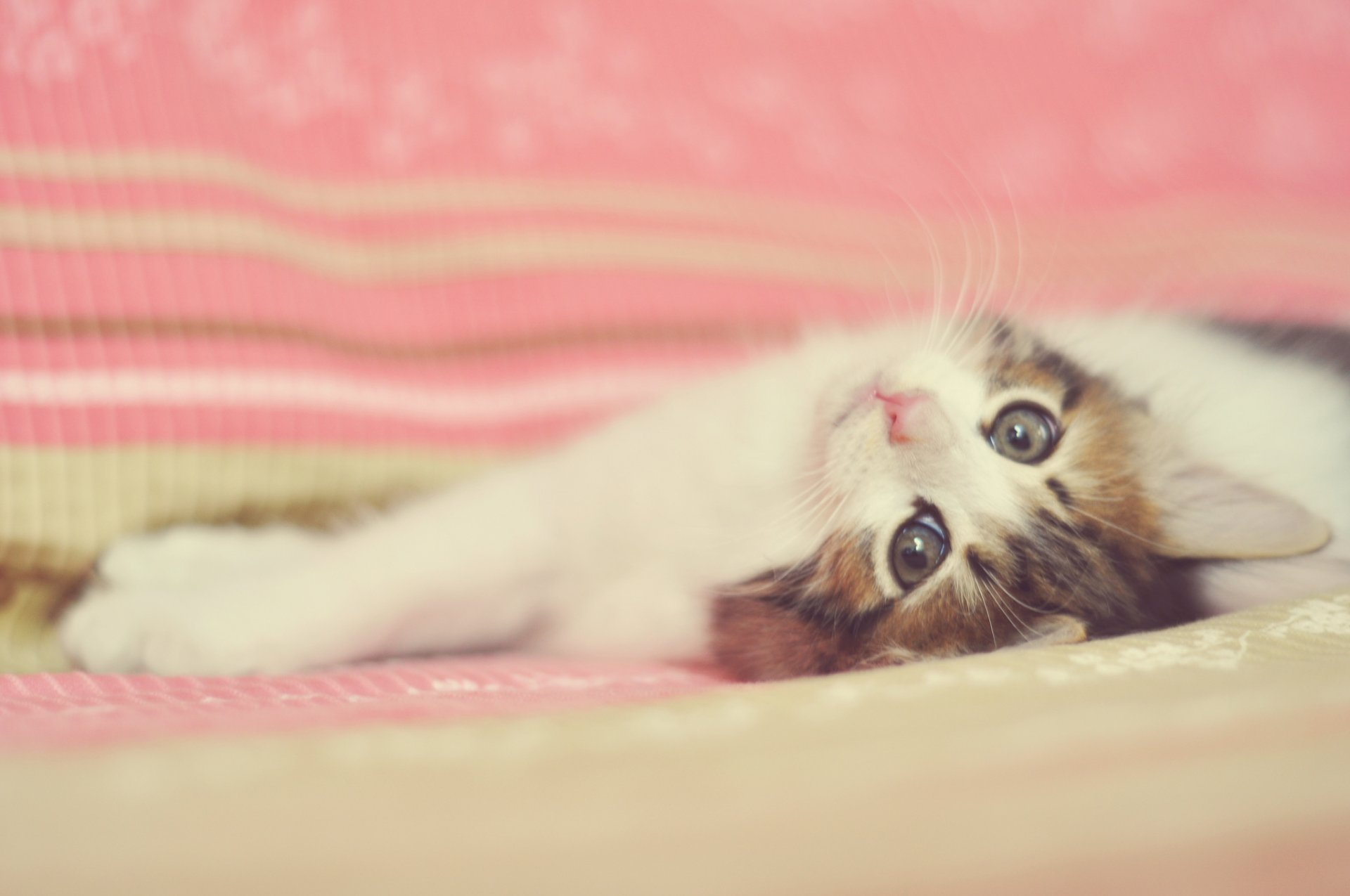 Słodki kotonek leży na kanapie patrzy na właściciela i chce coś powiedzieć