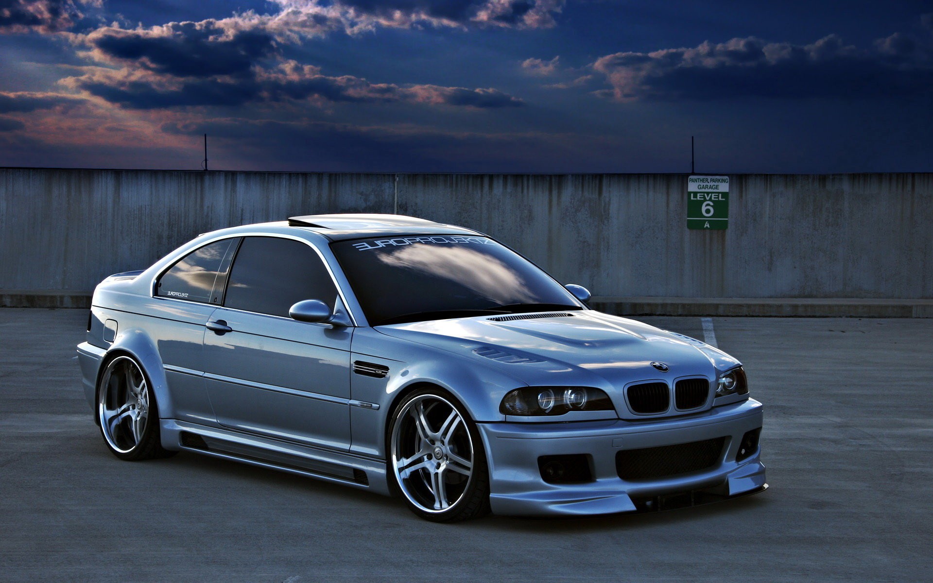 Szary samochód BMW stoi na czarnej podłodze