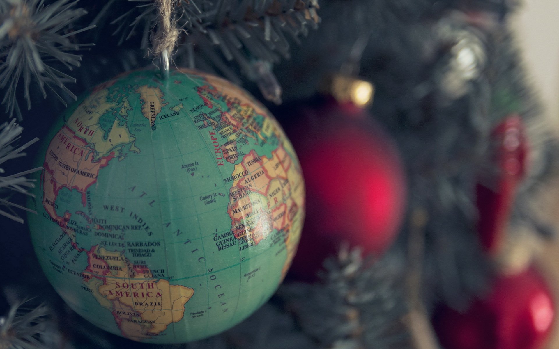 Święty Mikołaj trzyma Globus, który rozważają kobieta i dziewczyna
