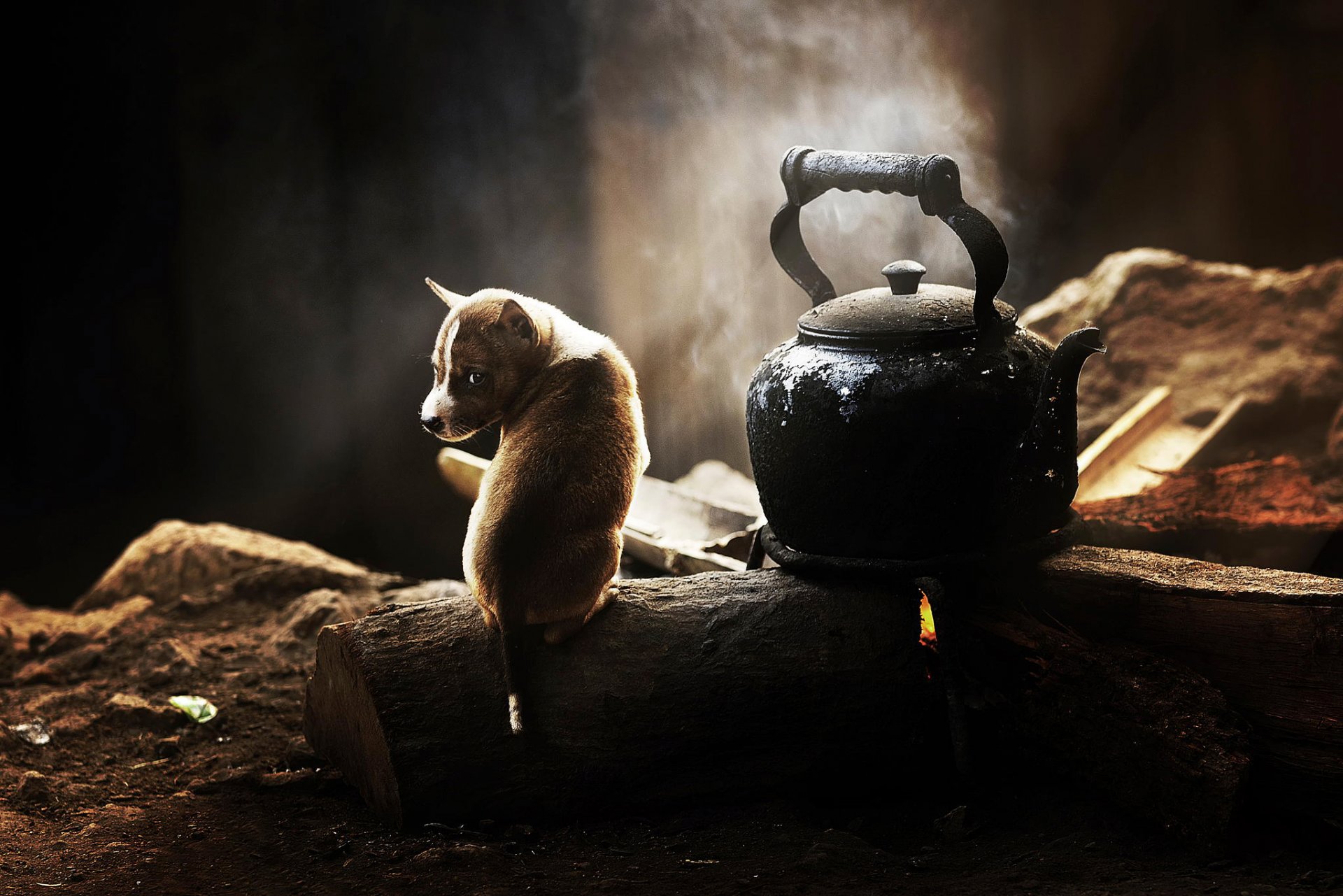 Jasny szczeniak z czarnym pyskiem na tle zielonych liści