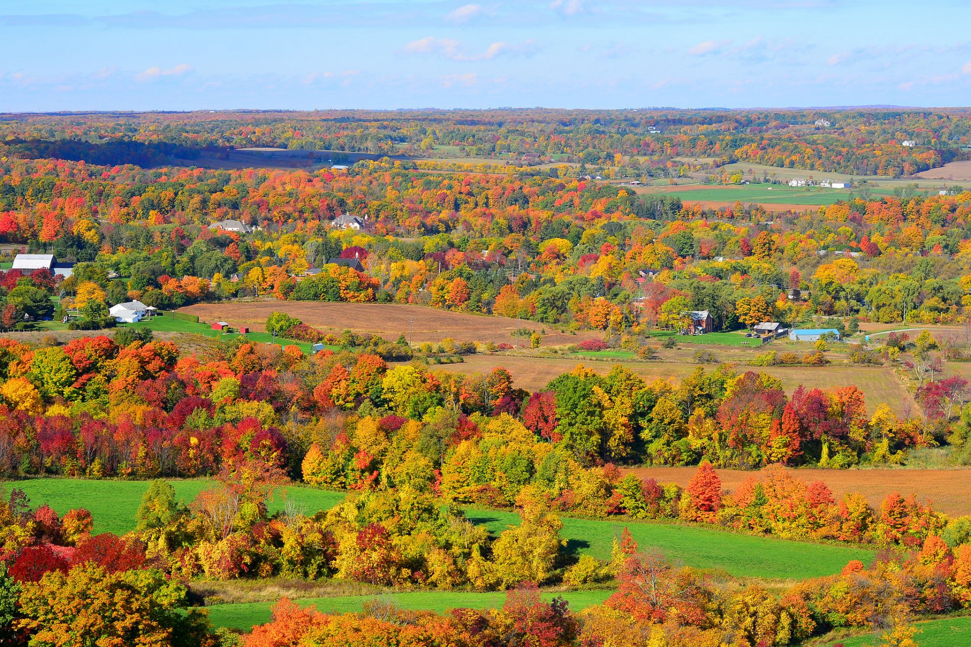 W drzewach pomarańczowe jesienne liście wyglądają spektakularnie na tle błękitnego nieba