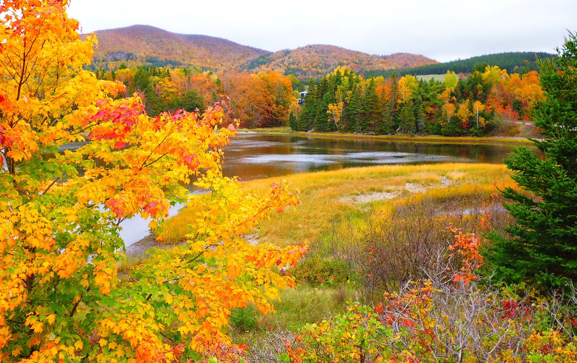 Jesienny krajobraz, liściasty, pożółkły las, wodospad wpada do rzekiJesienny krajobraz, liściasty, pożółkły las, wodospad wpada do rzeki