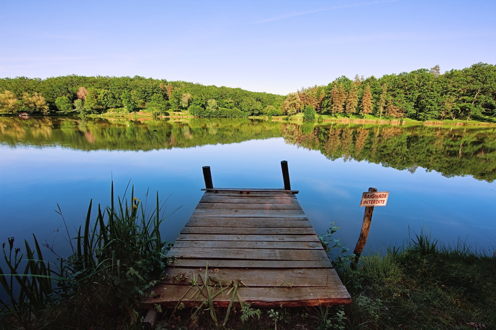 W centrum jezioro odbicie samego drzewa i nieba i chmur