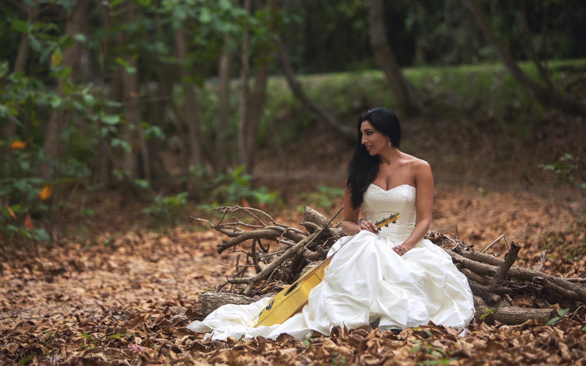 Dziewczyna w sukni ślubnej siedzi w lesie z gitarąDziewczyna w sukni ślubnej siedzi w lesie z gitarą