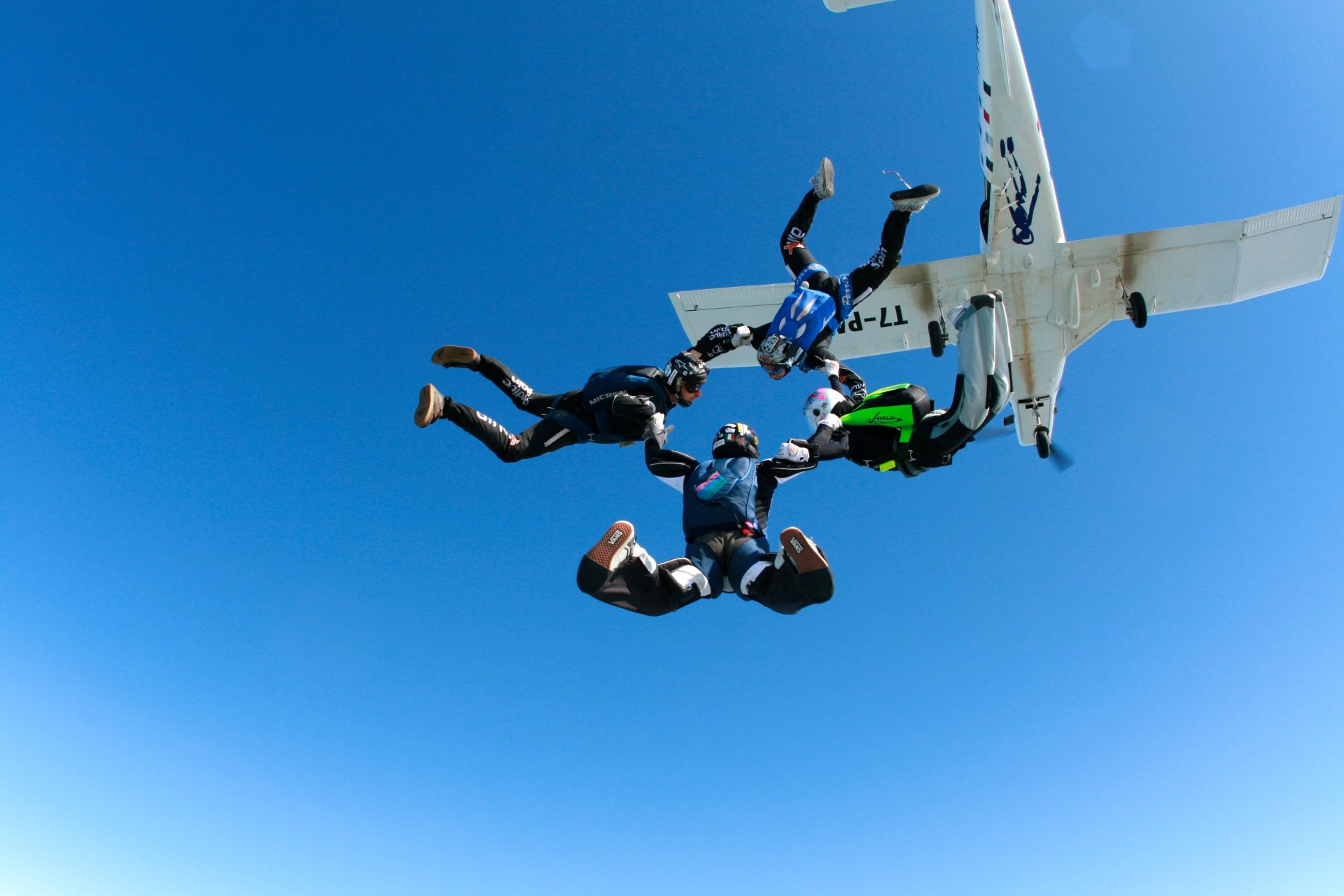 Spadochroniarze szybujący po niebie trzymając się za ręce