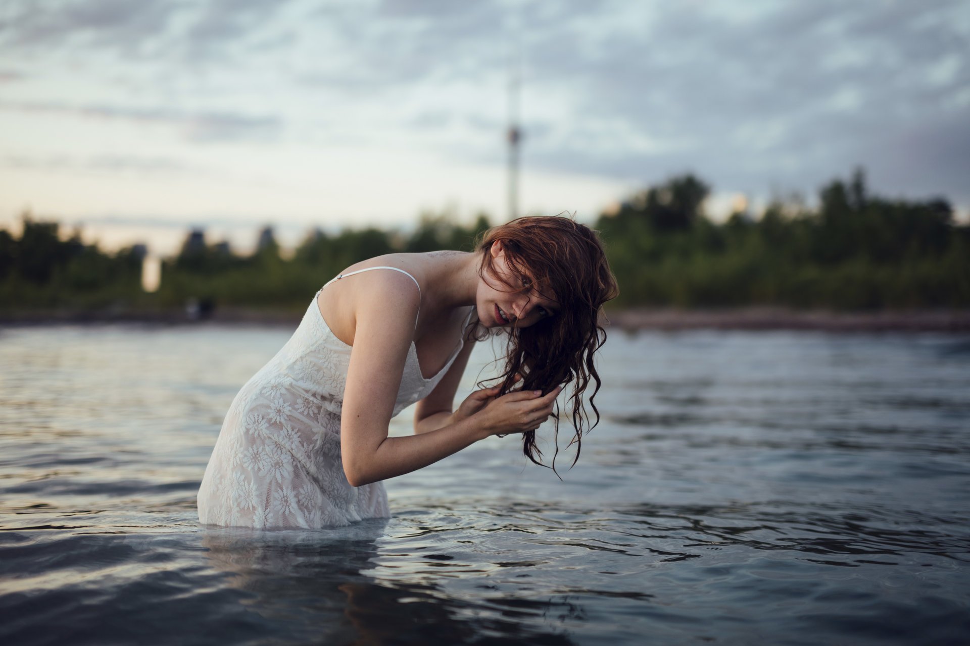 Dziewczyna z piegami i mokrymi włosami w wodzie