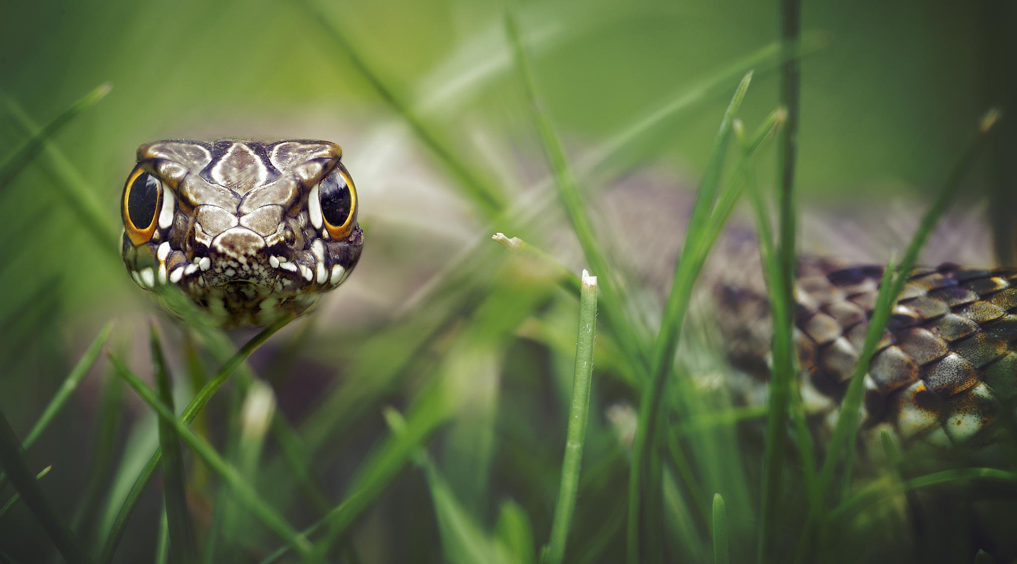 Wąż w trawie hipnotyzuje wzrokiem