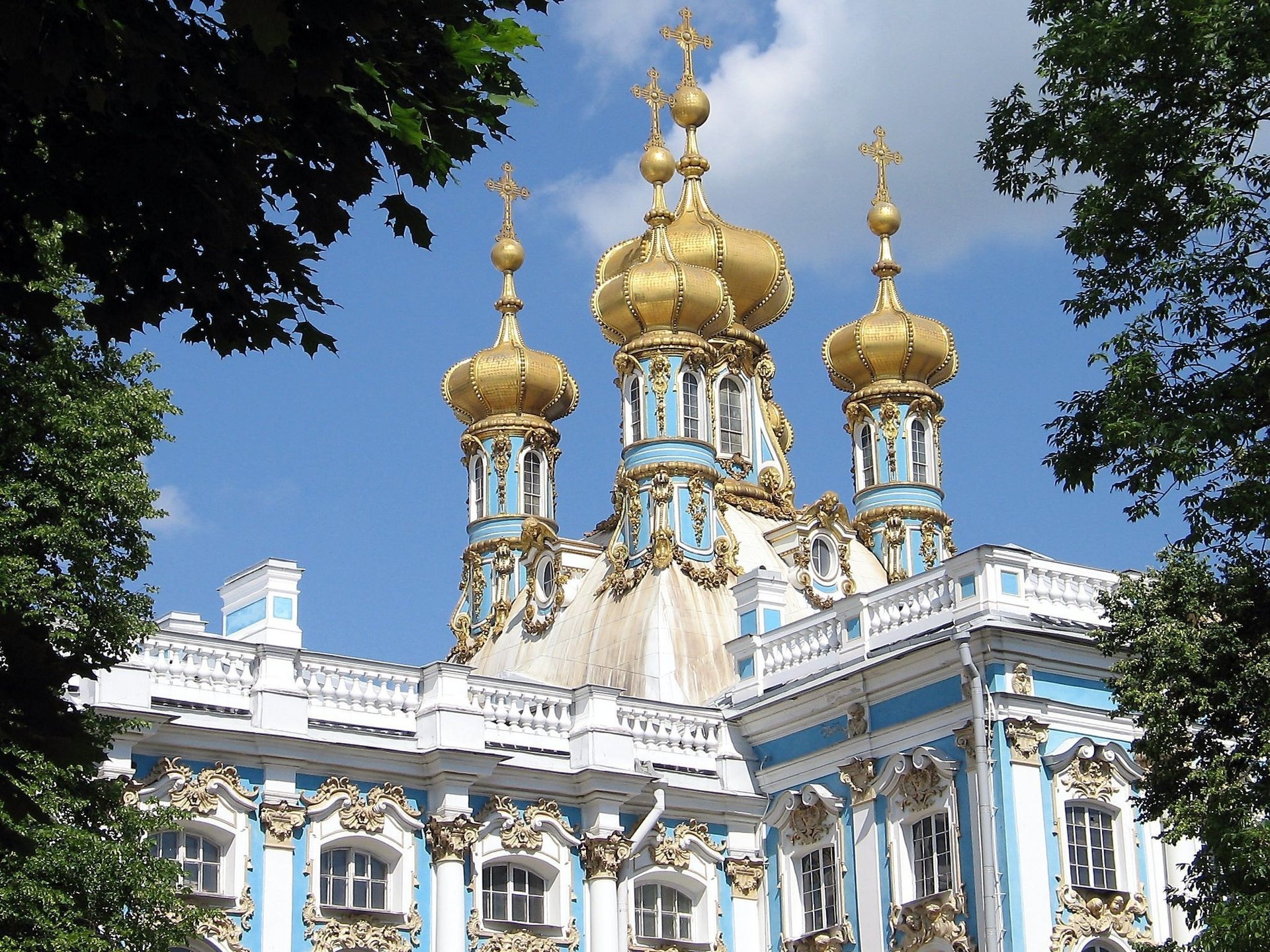 Złote kopuły świątyni na tle błękitnego nieba