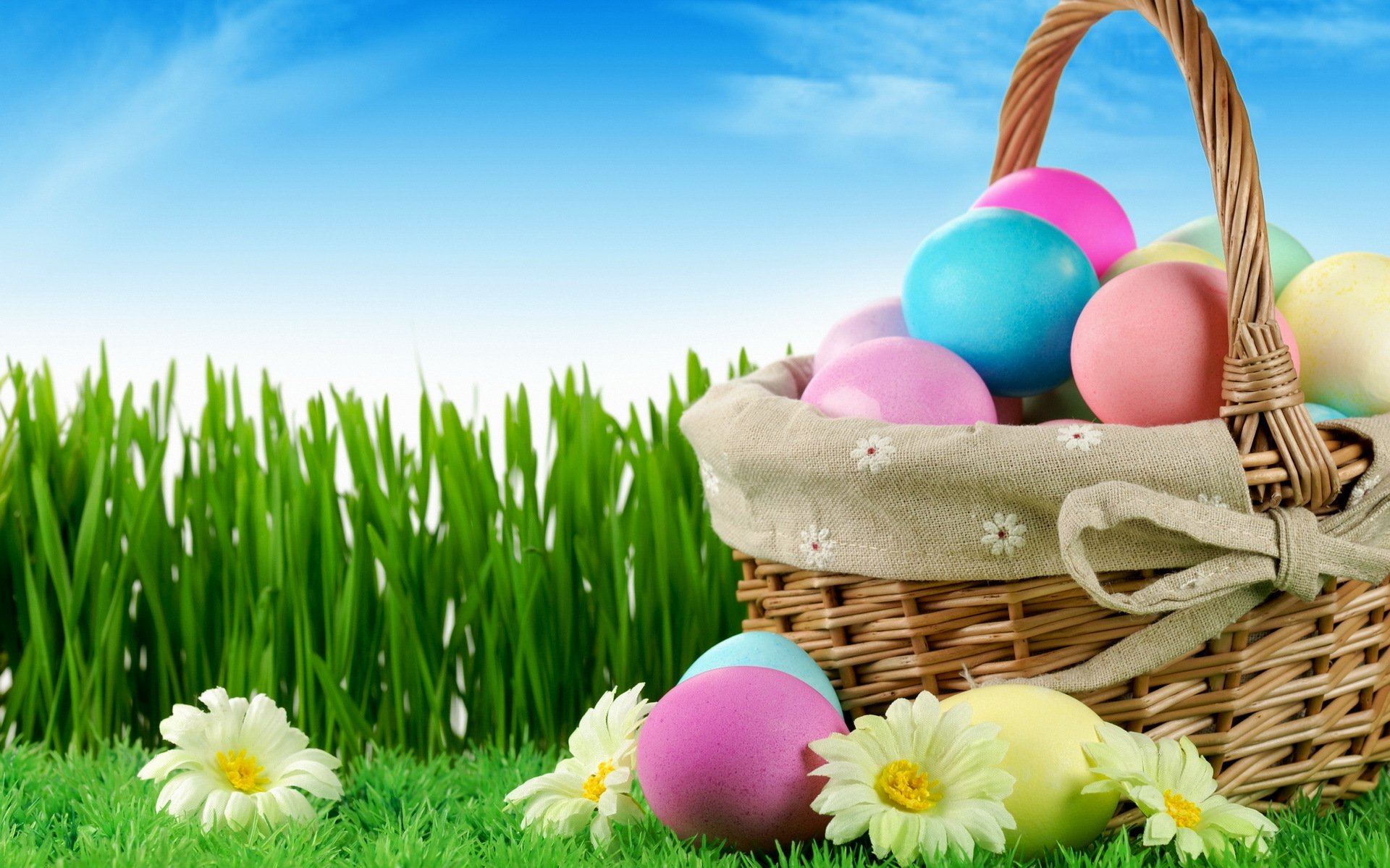 Koszyk pisanek na trawniku