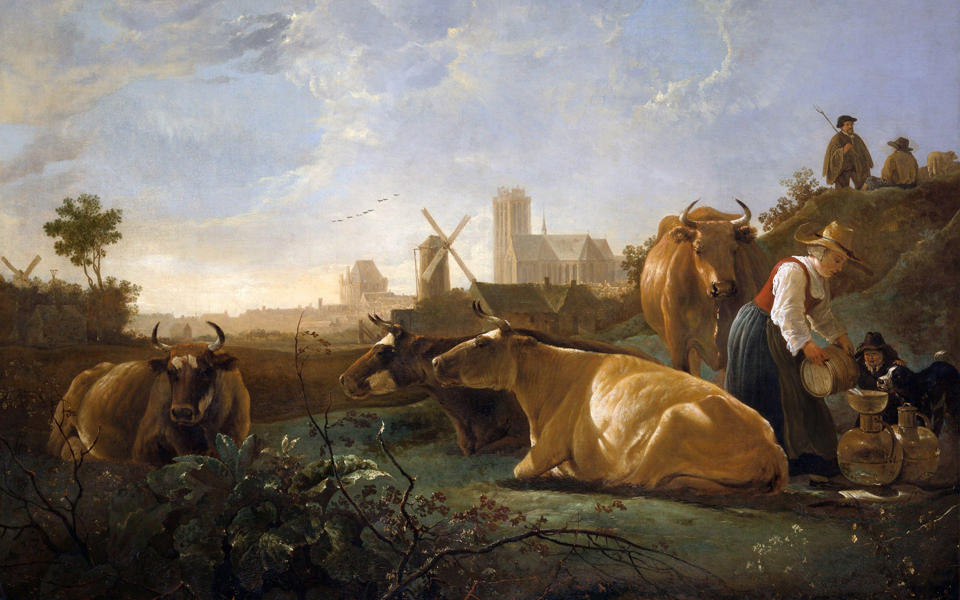 Krowy leżące na trawie. Dziewczyna z dzbanem