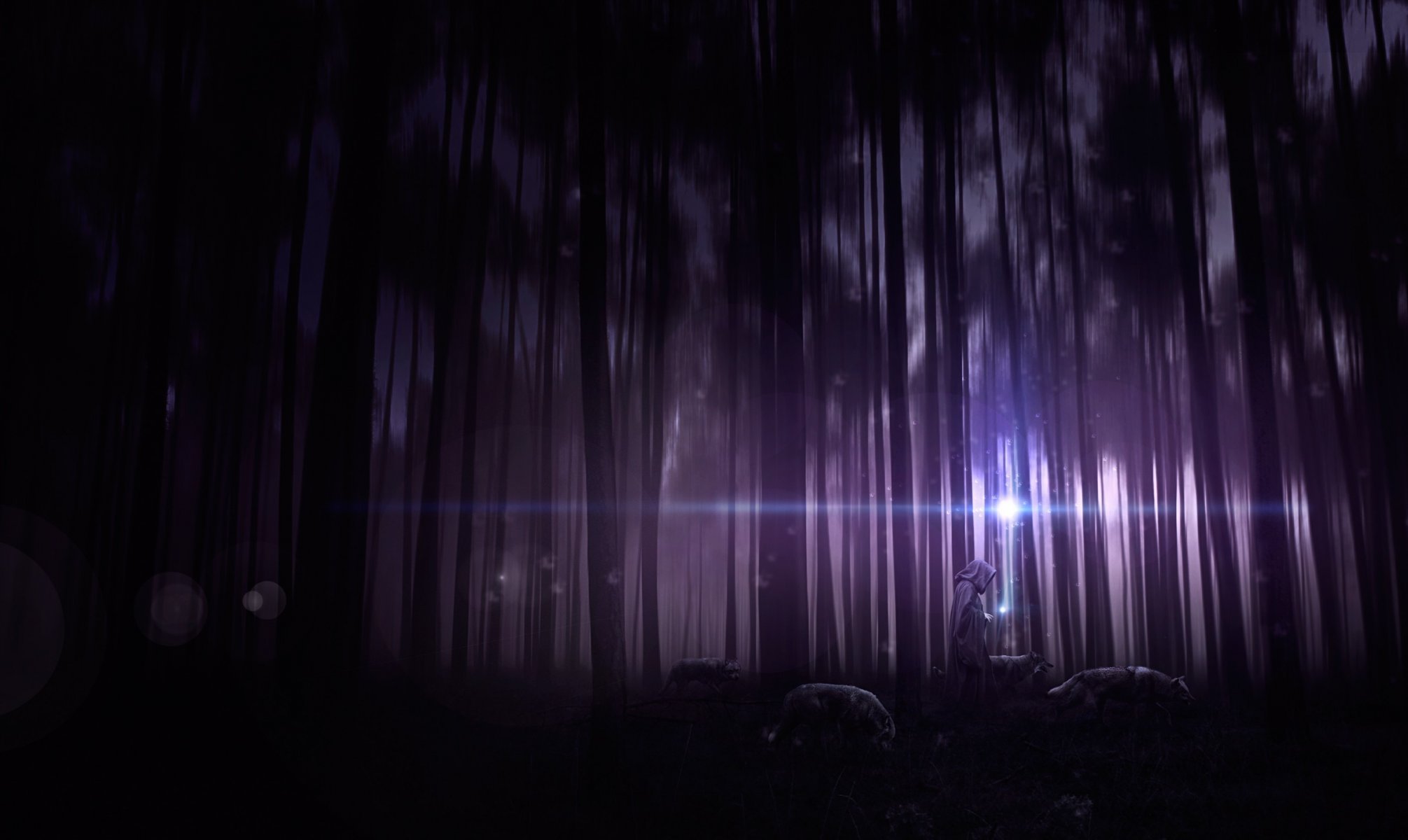 Roślinny wzór liści i kwiatów z magiczną kulą pośrodku na tle czarno-niebieskiego tła