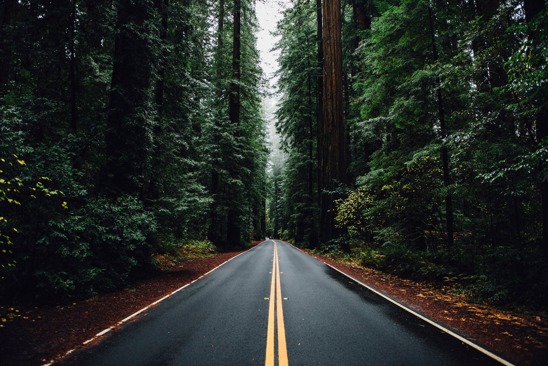 Wysokie choinki i droga do przyszłości w jesiennym lesie