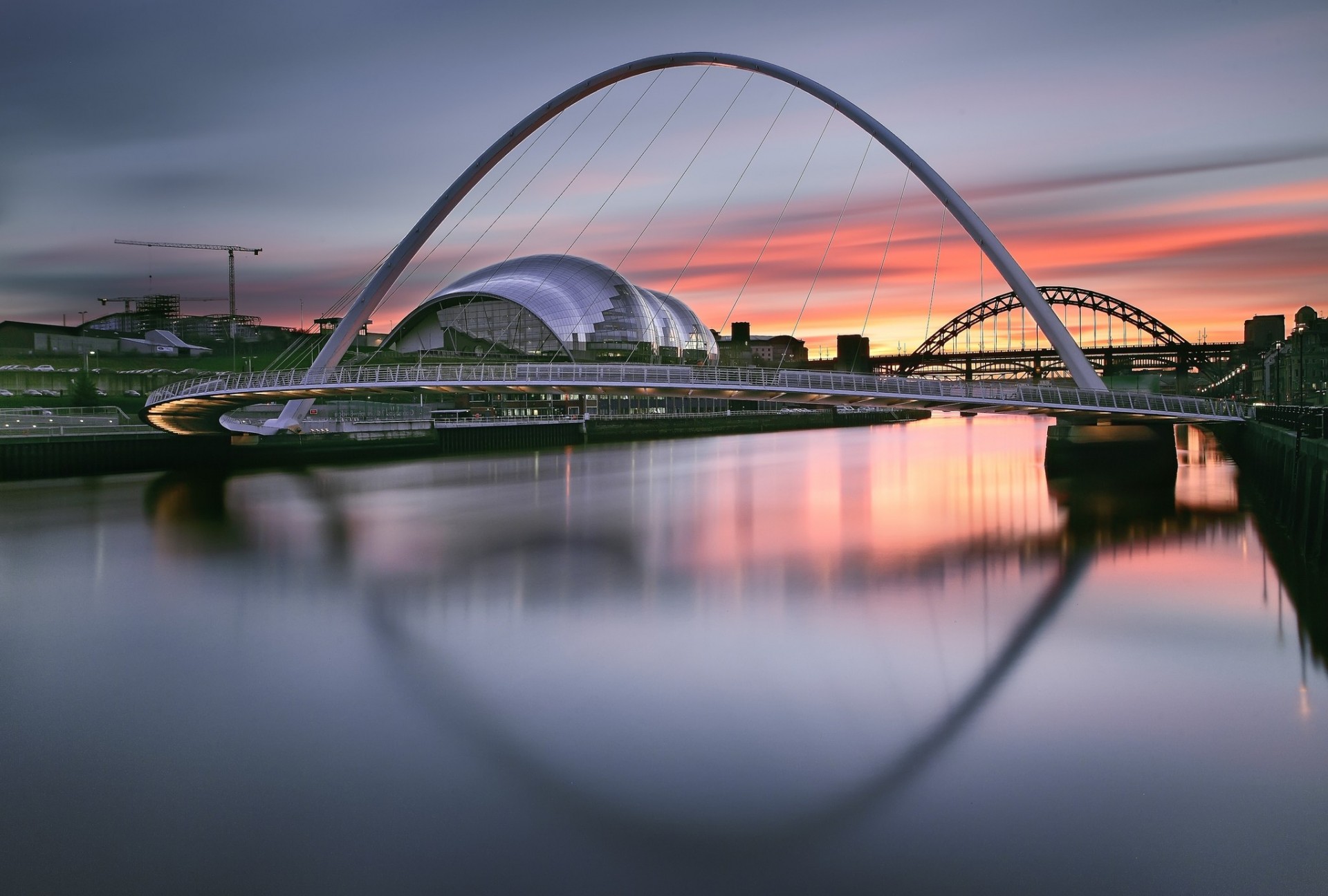 Most odbijający się w spokojnej powierzchni wody, tworzący iluzję okrągłych otworów
