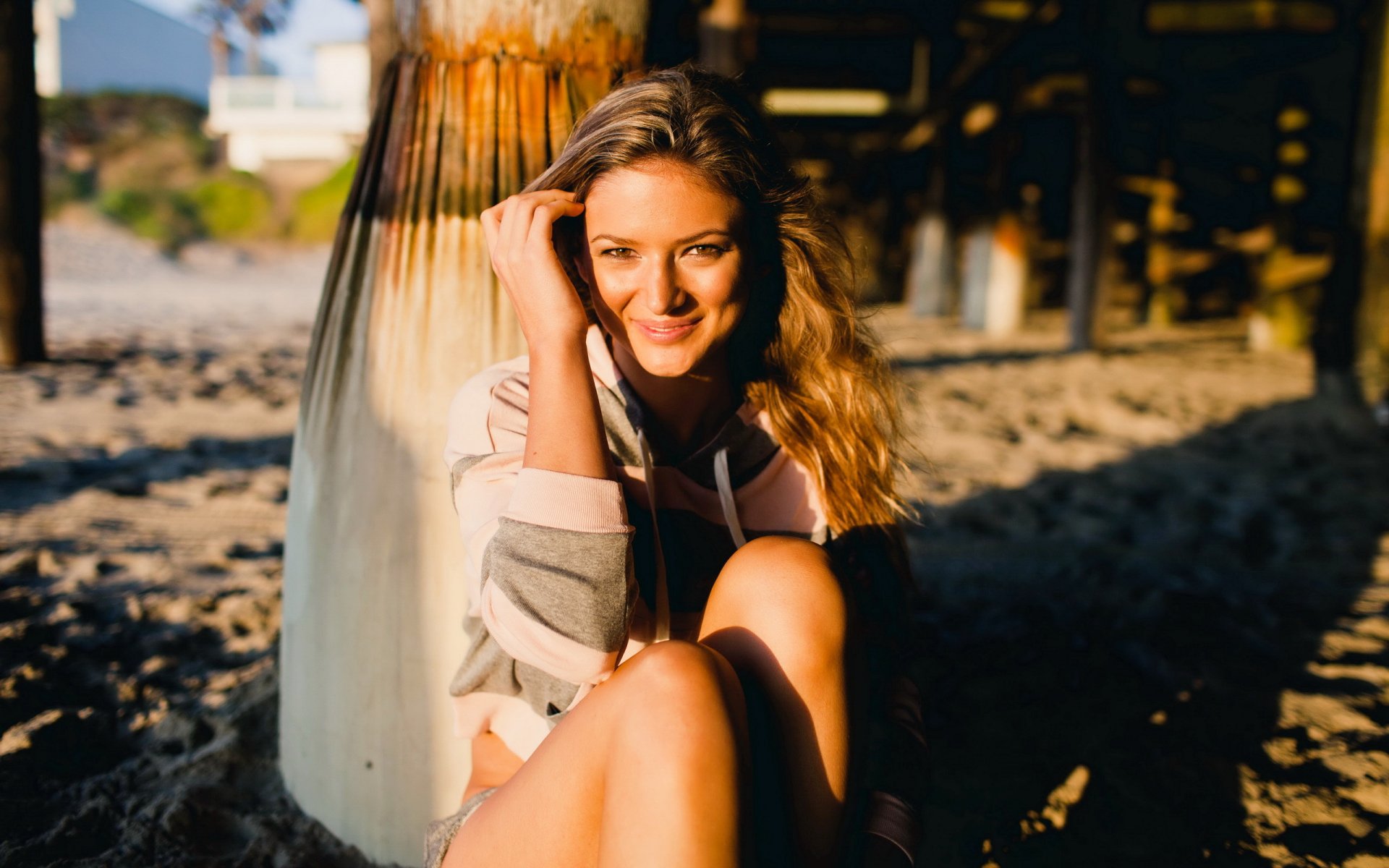 Uśmiechnięta dziewczyna na plaży w promieniach słońca