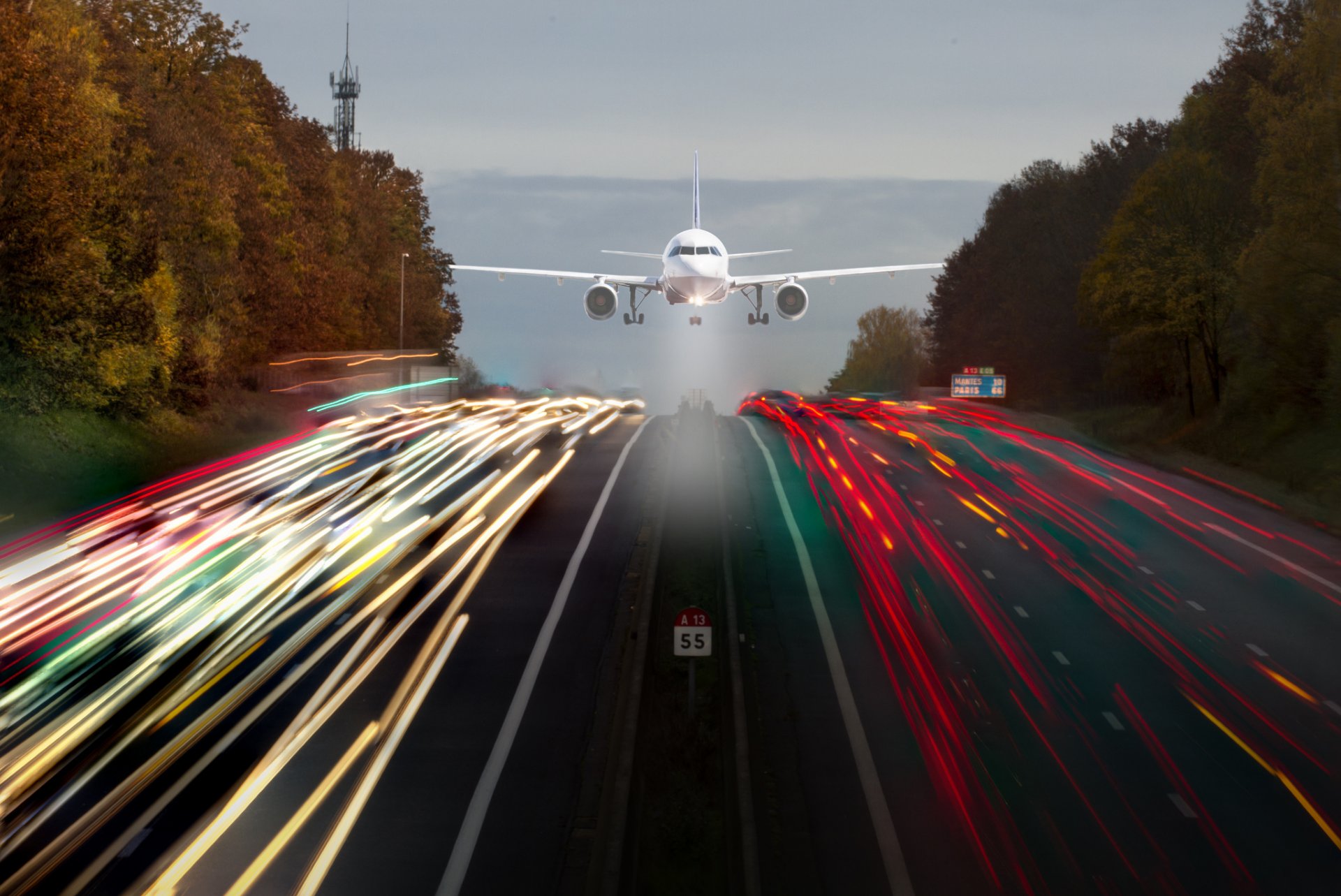 Samolot, który leci nisko nad drogą z jasnymi paskamiSamolot, który leci nisko nad drogą z jasnymi paskami