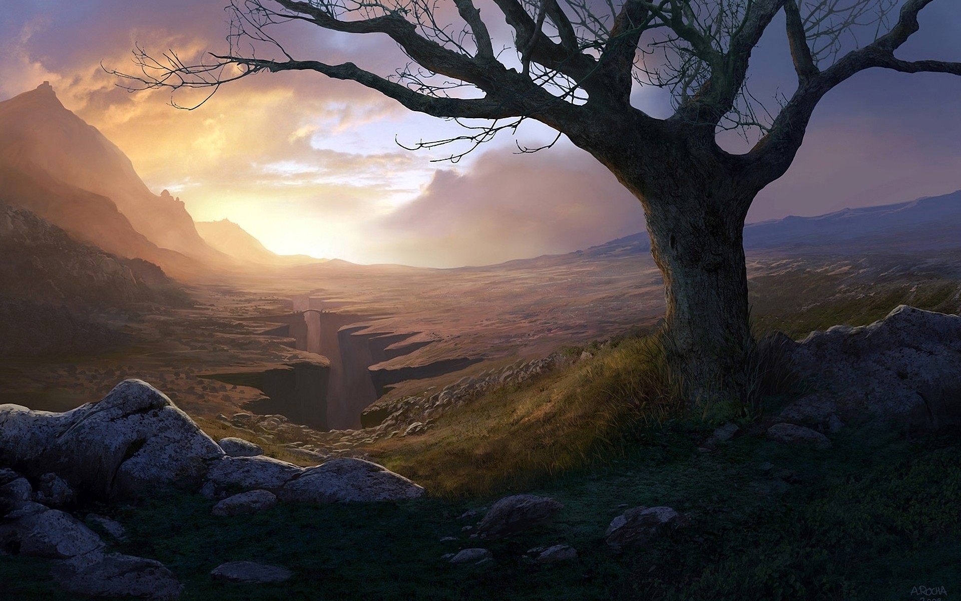 Obraz z krajobrazem jeziora i drzew na tle zachodu Słońca