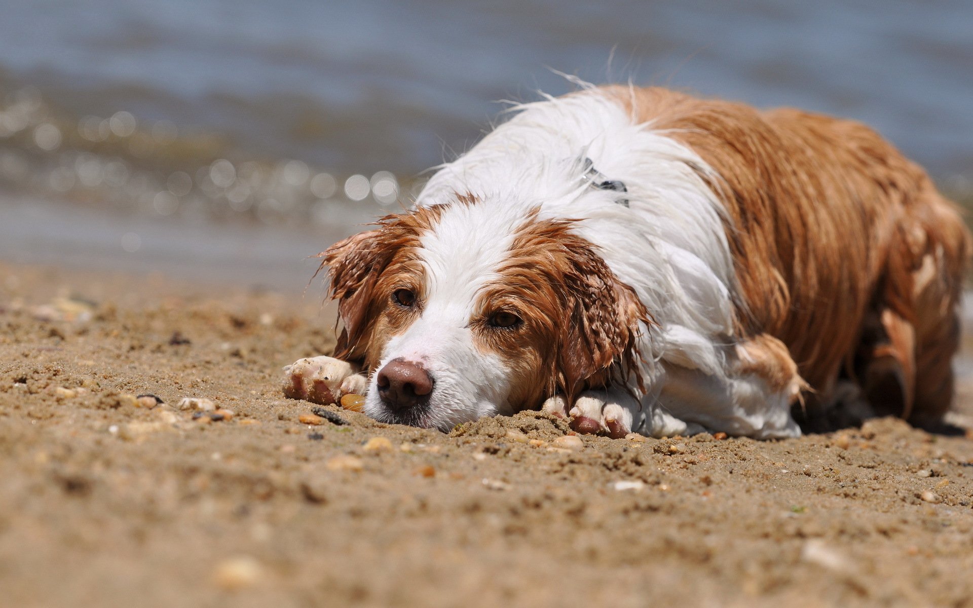 Zabawny mokry pies na plaży