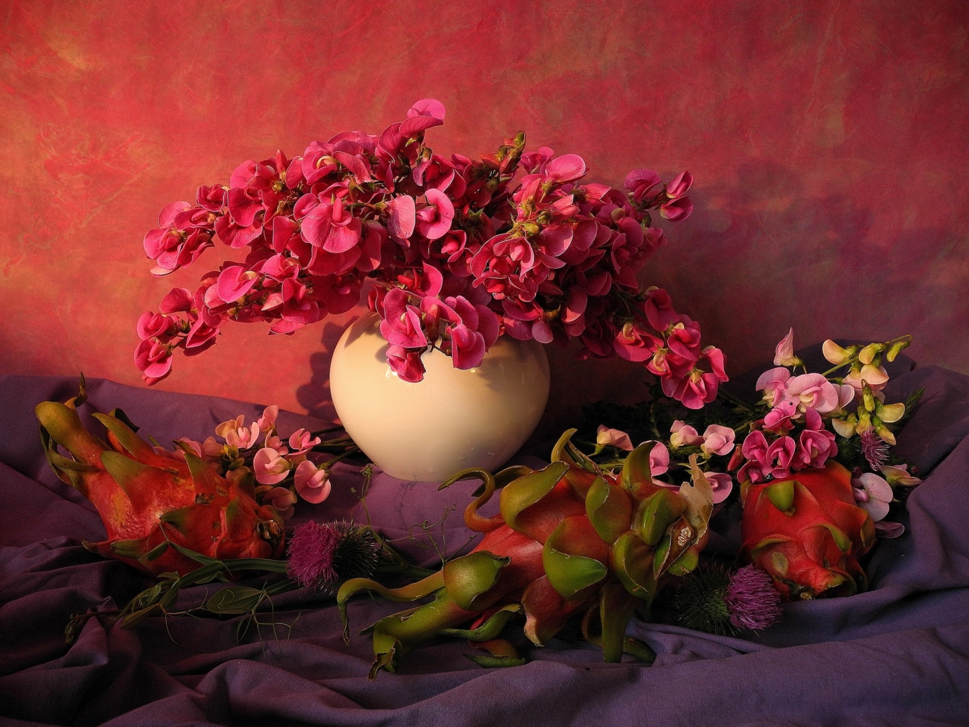 Martwa natura z owocami i kwiatami na czerwonym tle