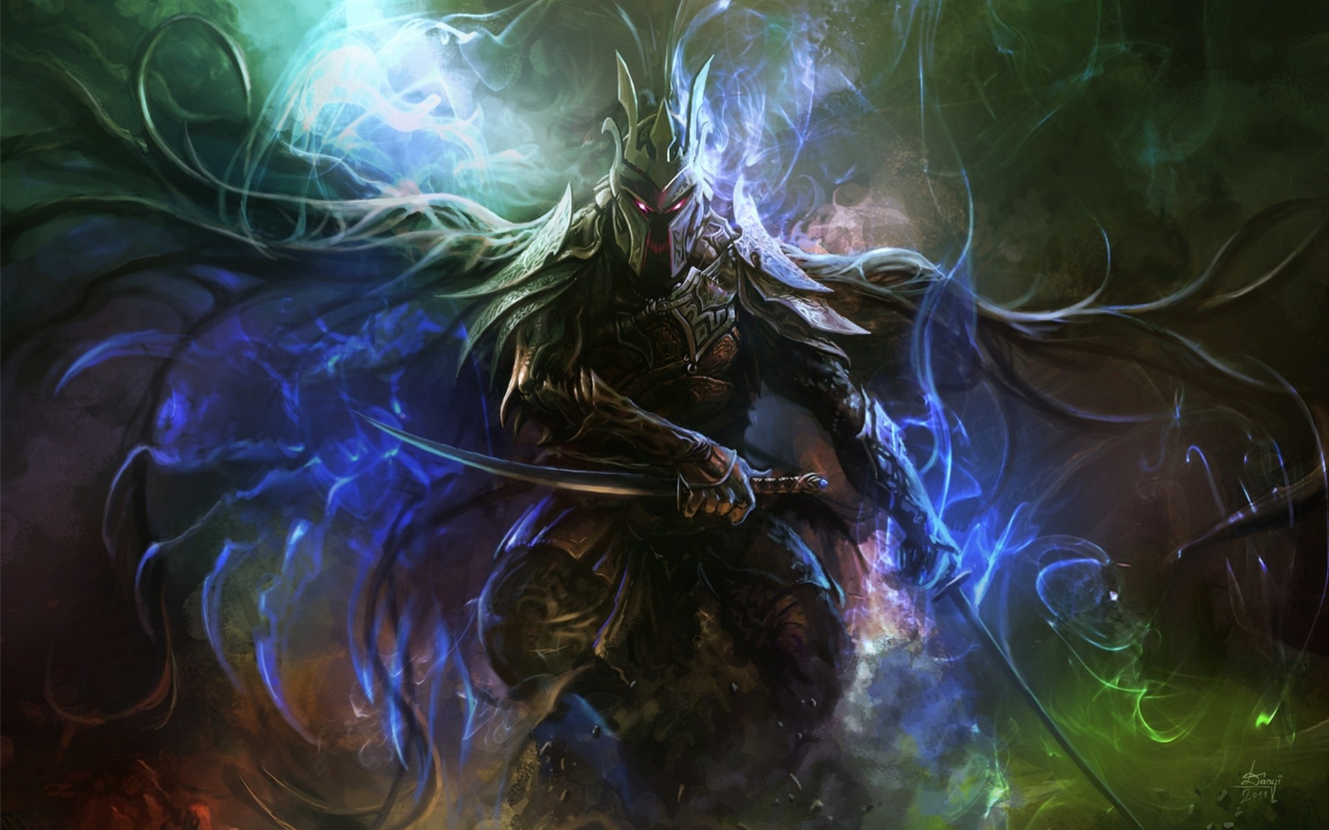 Wojownik w zbroi ze świecącymi oczami