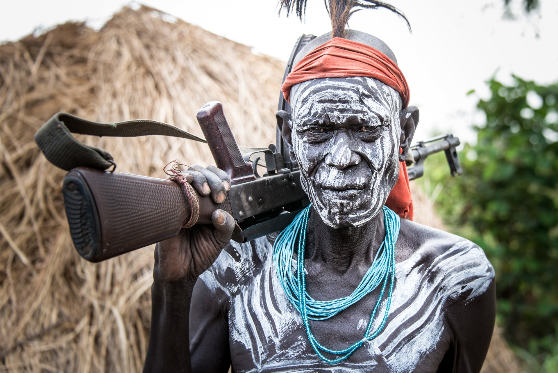 Brodaty wojownik w rękawiczkach trzymający żelazną rurę