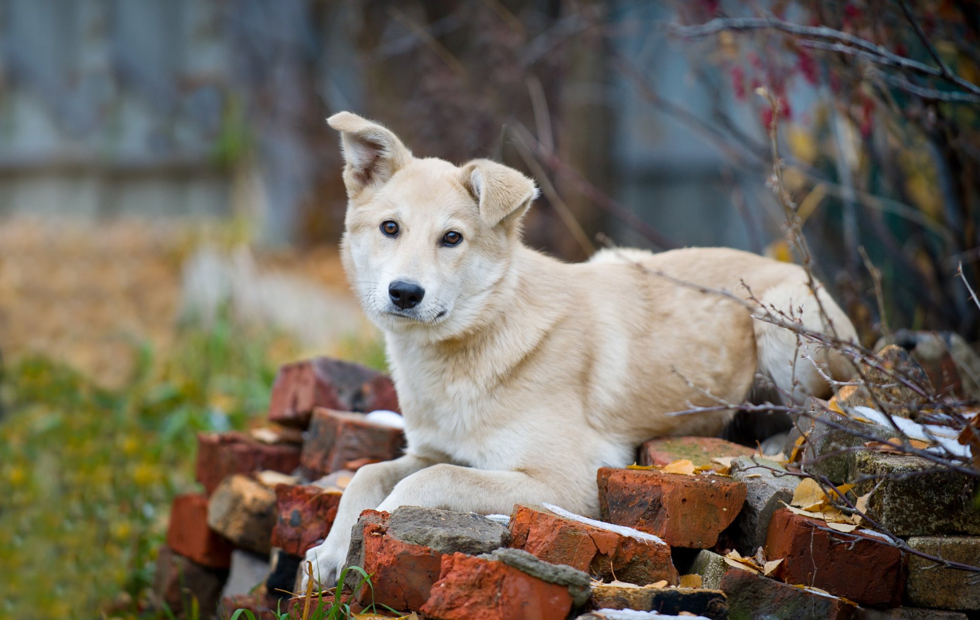Pies z wygiętym uchem leży na cegłach