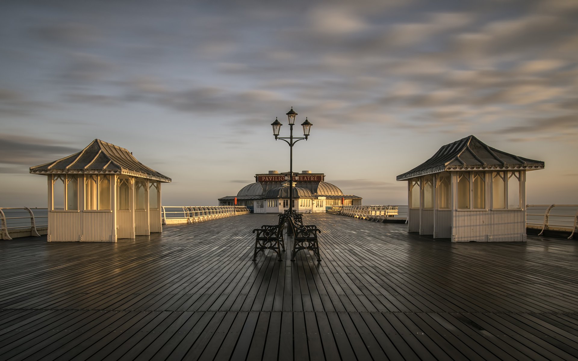 Molo nad jeziorem, z widokiem na drzewa i niebo