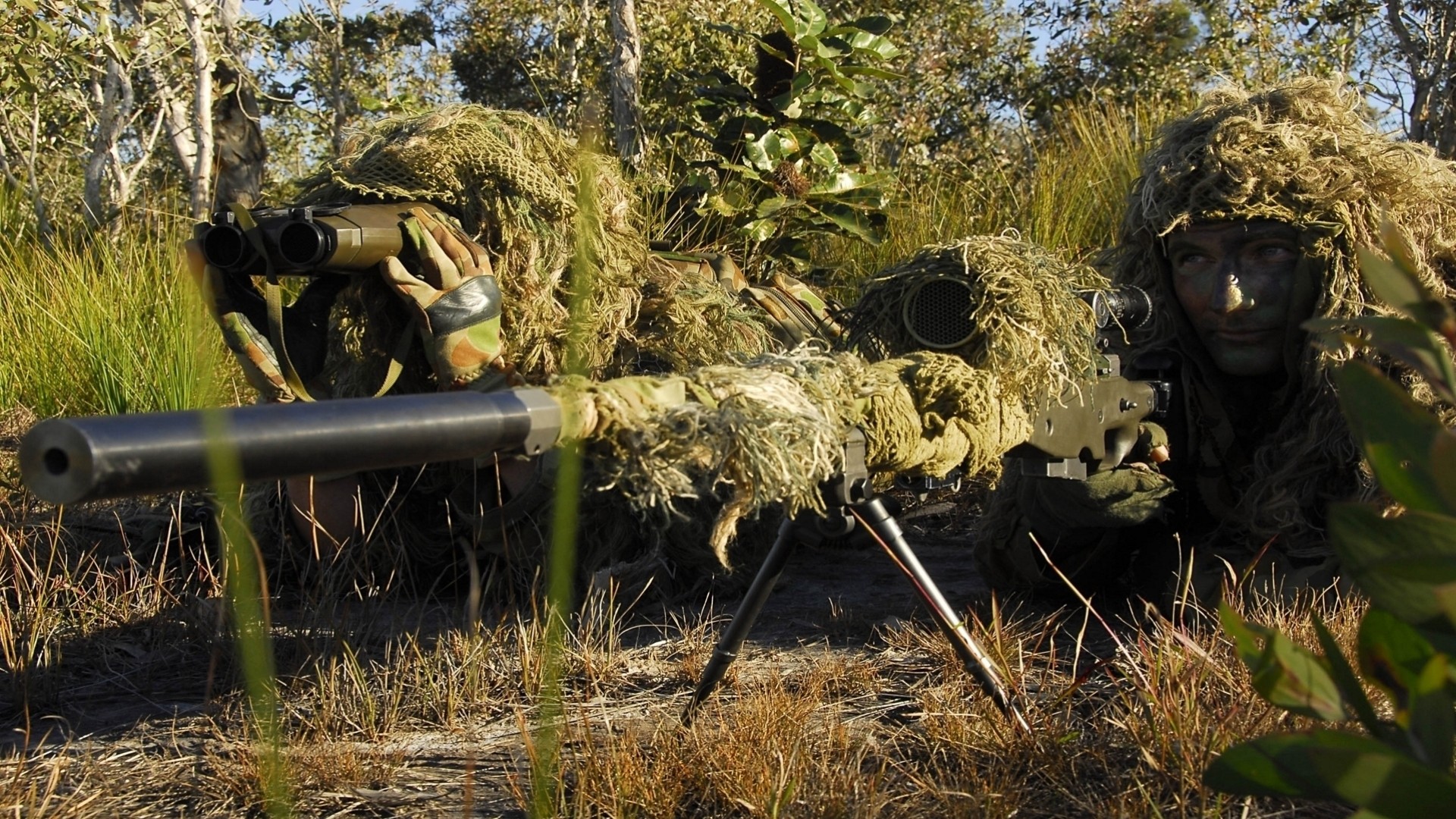 Zamaskowani snajperzy w zasadzce z bronią