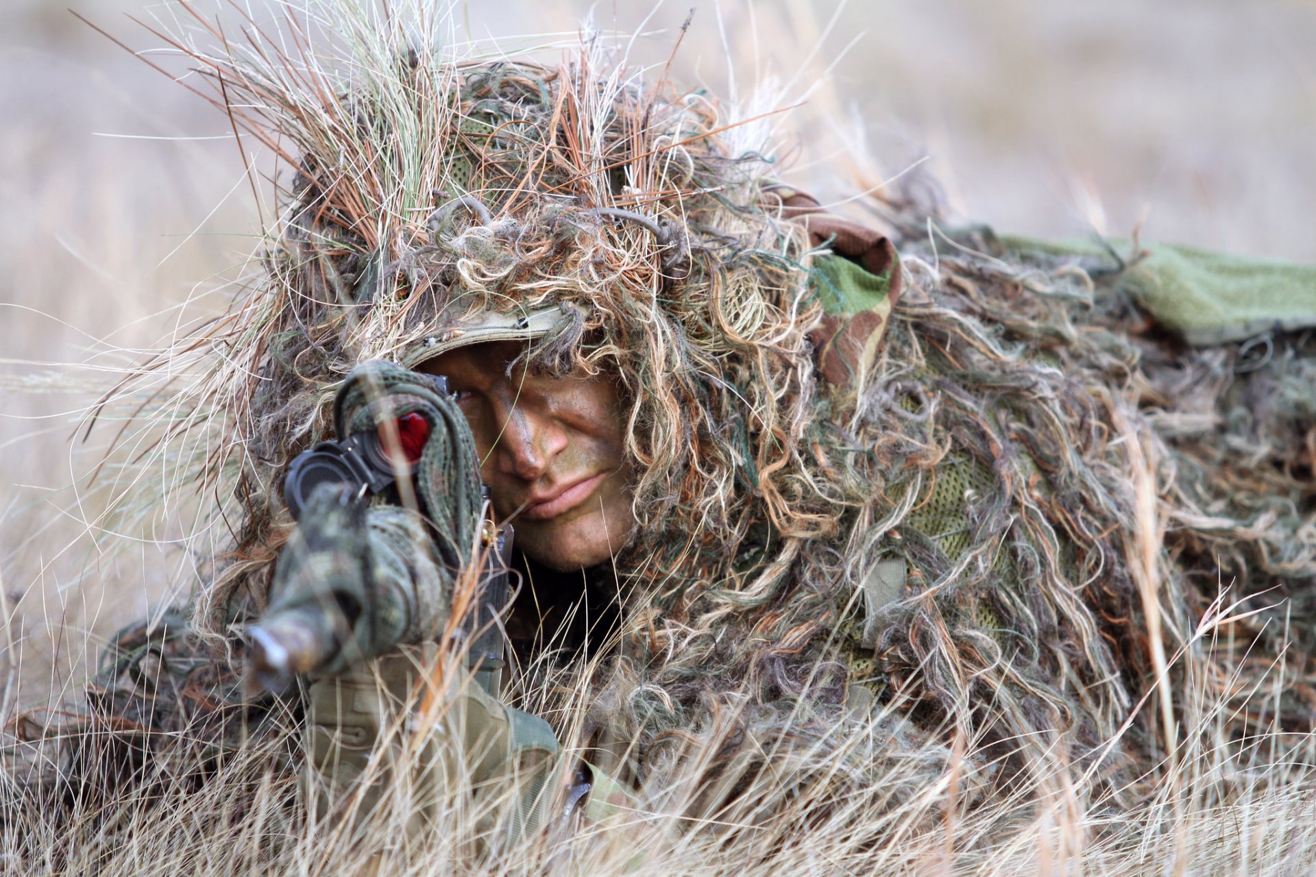 Snajper jest zamaskowany trawą i celuje w Karabin