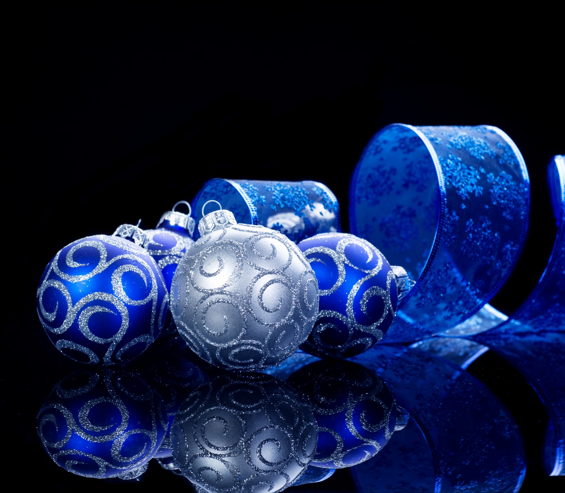 Stylowe pudełko. Niebiesko-biało-niebieskie paski na pudełku. Duża niebieska kokardka. Szczęśliwego Nowego Roku