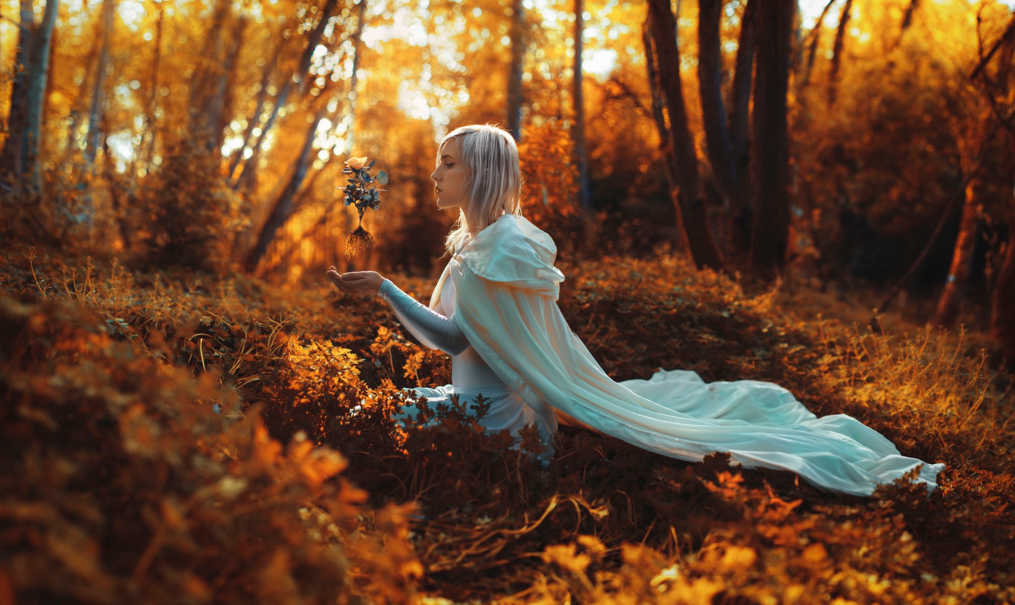 Dziewczyna w lesie z różą w rękach