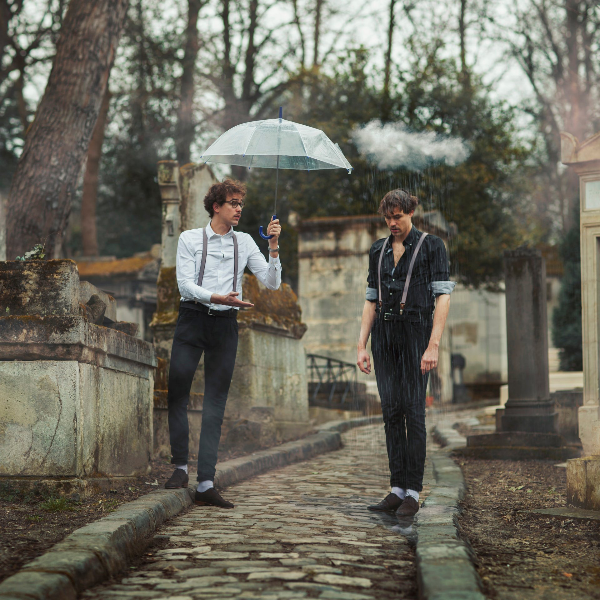 Dwóch mężczyzn w deszczu, jeden z nich pod parasolemDwóch mężczyzn w deszczu, jeden z nich pod parasolem