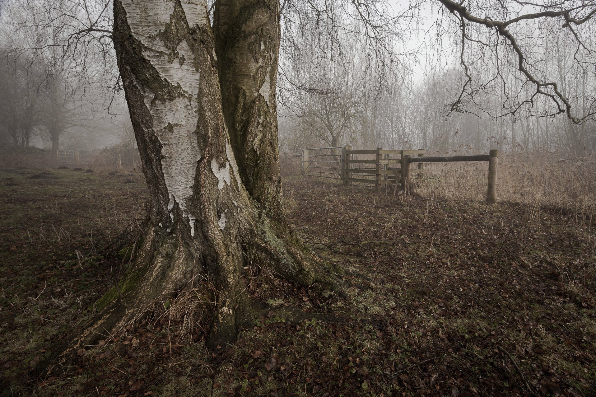 Ogrodzenie wzdłuż drogi, zielona trawa i pnie drzew