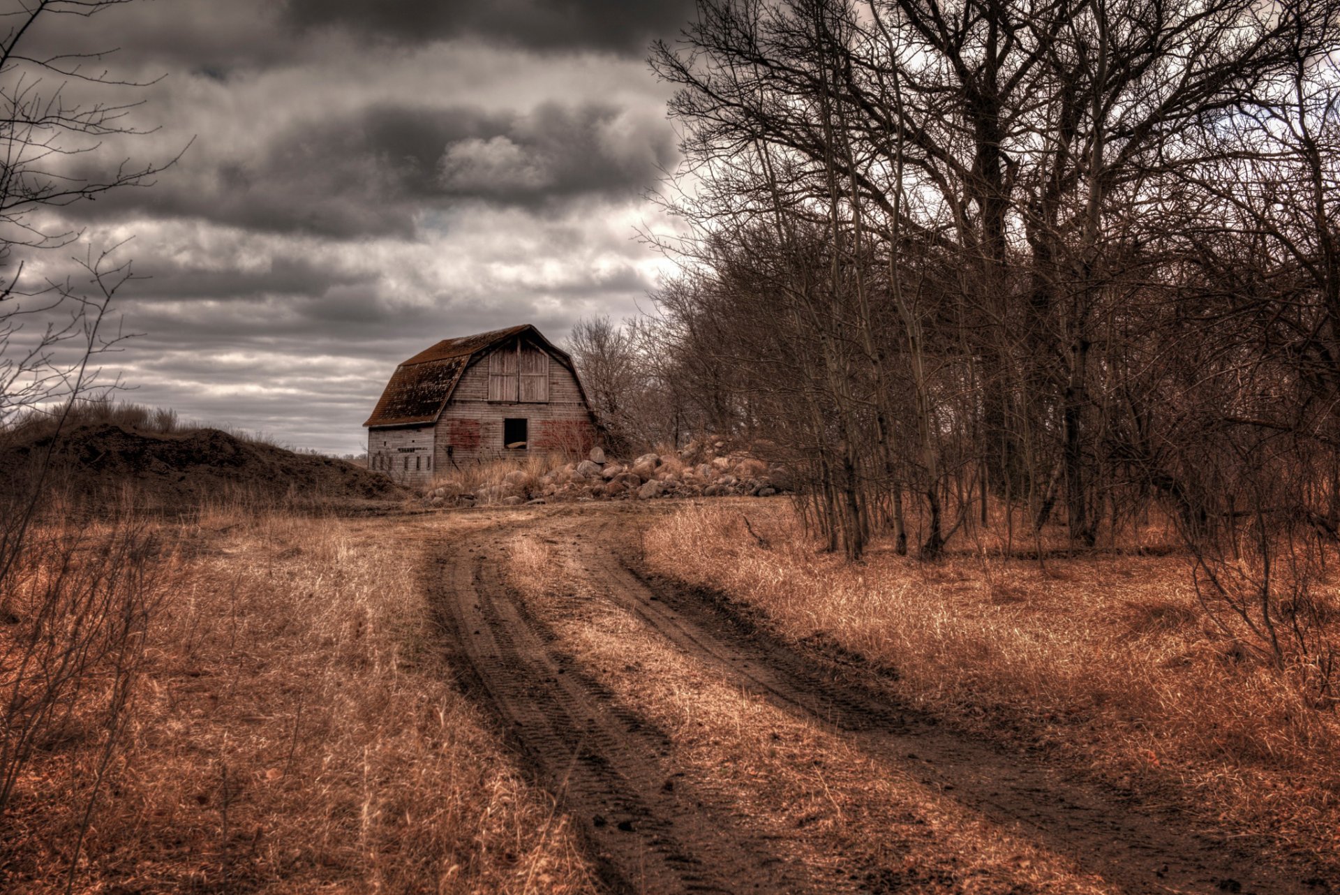 Jesienny pochmurny dzień. Opuszczona stodoła