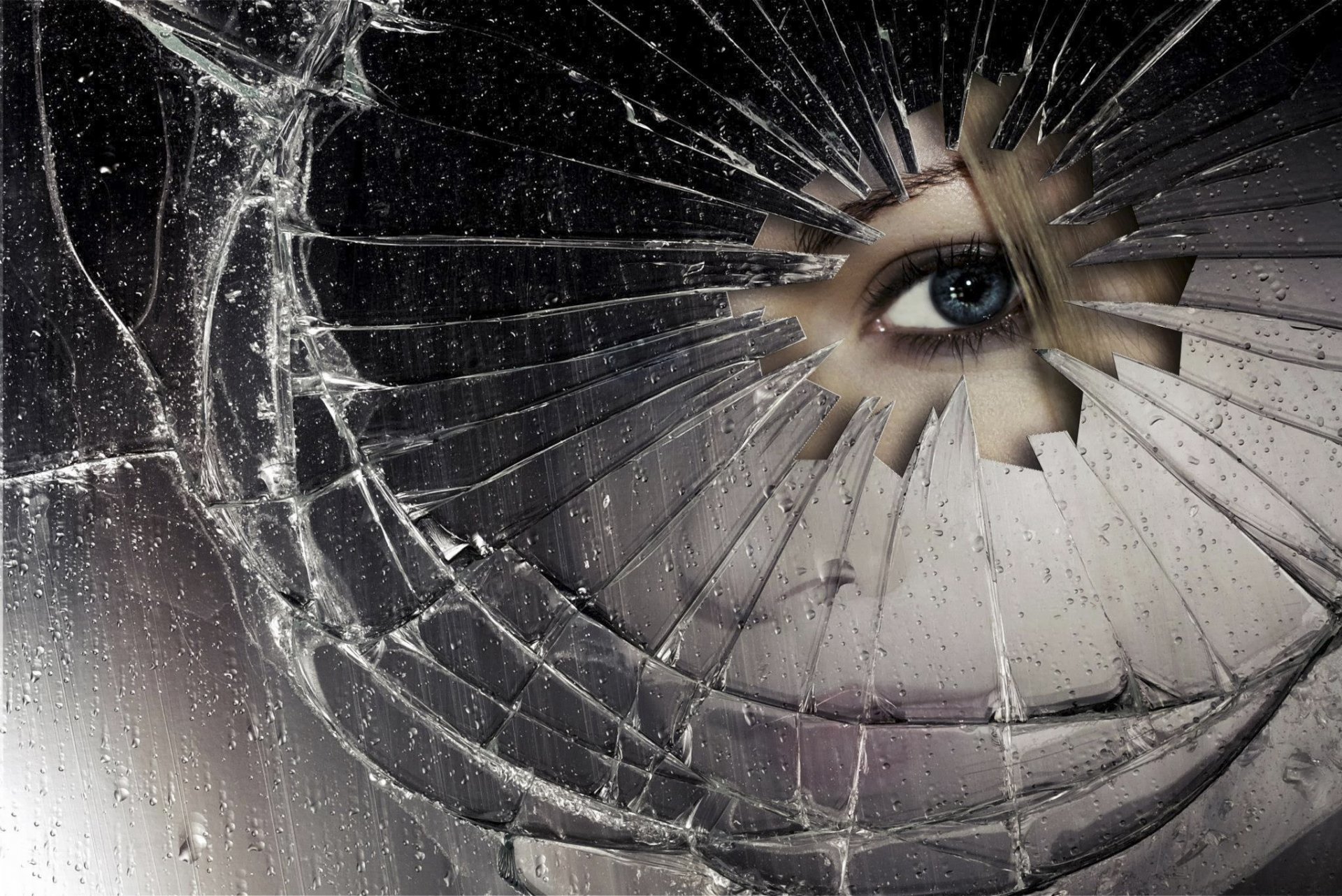 Dziewczyna patrzy przez dziurę rozbitego lustra